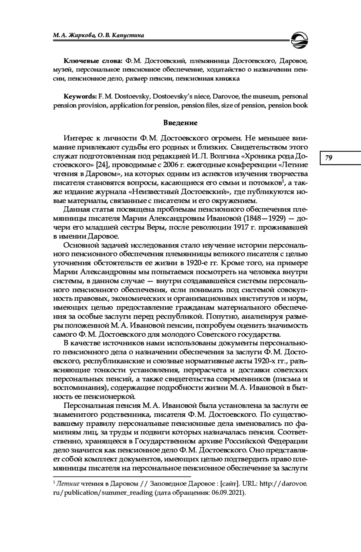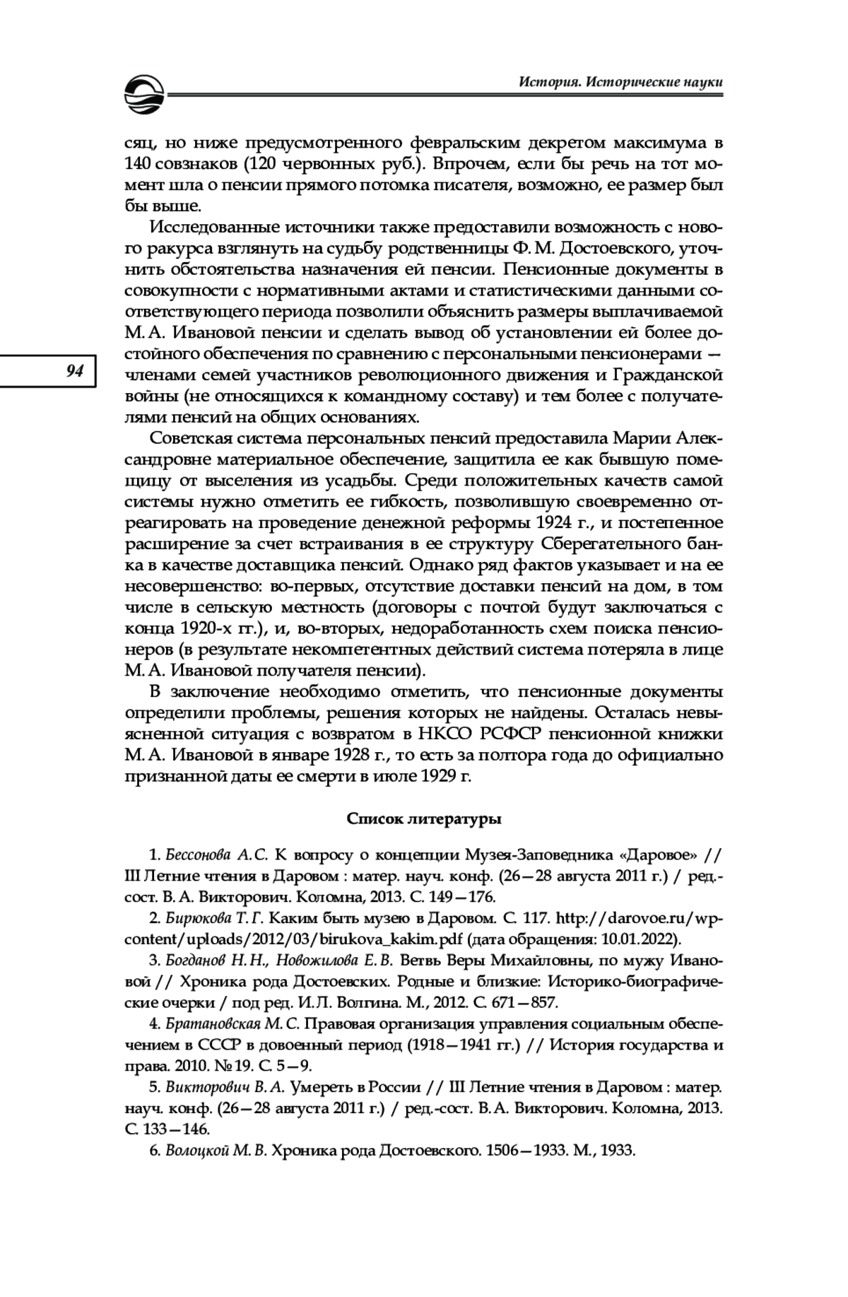 Интерес к личности Ф. М. Достоевского огромен. Не меньшее внимание привлекают судьбы его родных и близких. Свидетельством этого служат подготовленная под редакцией И. Л. Волгина «Хроника рода Достоевского» [24], проводимые с 2006 г. ежегодные конференции «Летние чтения в Даровом», на которых одним из аспектов изучения творчества писателя становятся вопросы, касающиеся его семьи и потомков1, а также издание журнала «Неизвестный Достоевский», где публикуются новые материалы, связанные с писателем и его окружением. Данная статья посвящена проблемам пенсионного обеспечения племянницы писателя Марии Александровны Ивановой (1848—1929) — дочери его младшей сестры Веры, после революции 1917 г. проживавшей в имении Даровое
