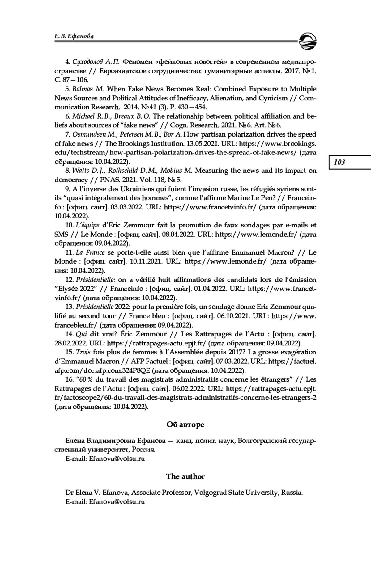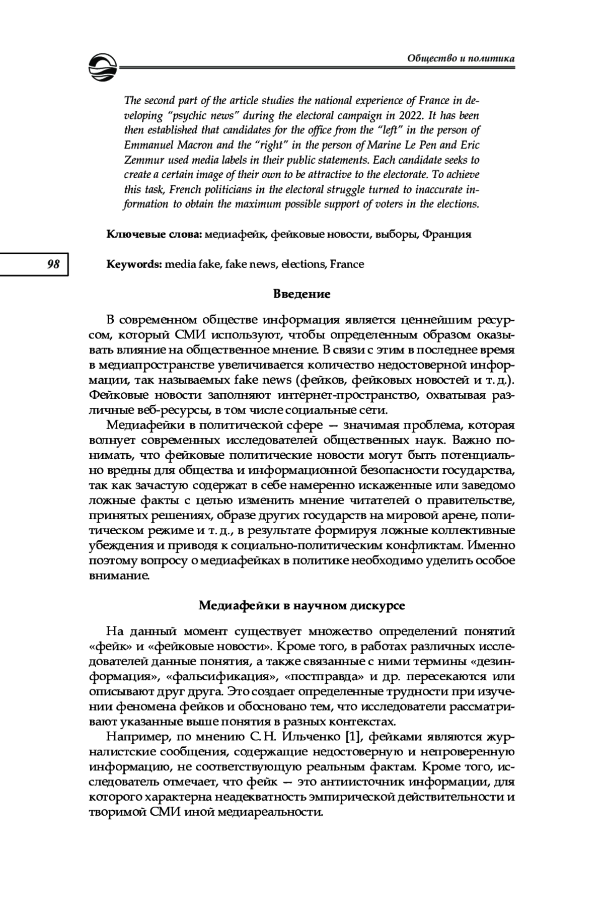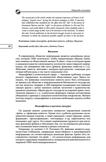 В современных реалиях наибольшее внимание уделяется медиафейкам в политике, целью которых является манипуляция общественным мнением и устранение политического конкурента. В апреле 2022 г. во Франции прошли достаточно напряжённые выборы президента, которым предшествовала предвыборная кампания с использованием фейков. Цель данного исследования заключается в том, чтобы показать стратегию кандидатов в медиапространстве в период предвыборной кампании во Франции в 2022 г. В первой части публикации представлен концептуальный анализ феномена «фейк» в зарубежном и российском научном дискурсе. Установлено, что фейковые новости составляют угрозу обществу и государству, они призваны дезинформировать население и сформировать ложные коллективные убеждения. В политическом медиапространстве ложные новости связаны с партийной принадлежностью и отличаются идеологической поляризацией. Во второй части публикации описан национальный опыт Франции по формированию «псевдоновостей» в период электорального цикла в 2022 г. Установлено, что во время предвыборной кампании кандидаты в президенты от «левых» в лице Эммануэля Макрона и «правых» в лице Марин Ле Пен и Эрика Земмура использовали в своих публичных заявлениях медиафейки. Каждый кандидат стремится создать себе определенный образ, который будет привлекателен для электората. Для достижения этой задачи политики Франции в избирательной борьбе обращались к недостоверной информации для получения максимально возможной поддержки избирателей на выборах
