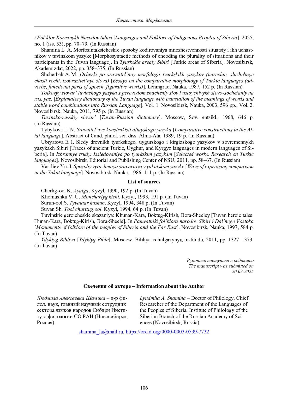20. Шамина Л. А. Морфосинтаксические способы кодирования множественности ситуаций и их участников в тувинском языке // Тюркские ареалы Сибири. Новосибирск: Академиздат, 2022. С. 358-375.