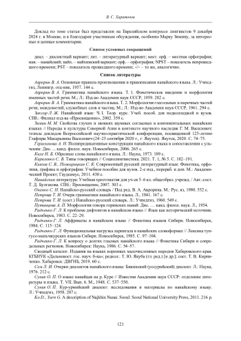 5. Зимин М. М. Свойства глухих и звонких шумных согласных в континентальных нанайских языках // Народы и культуры Северной Азии в контексте научного наследия Г. М. Василевич: тезисы докладов Всероссийской научно-практической конференции, посвященной 125-летию Глафиры Макарьевны Василевич (24-25 сентября 2020 г., г. Якутск). Якутск, 2020. С. 74-75.