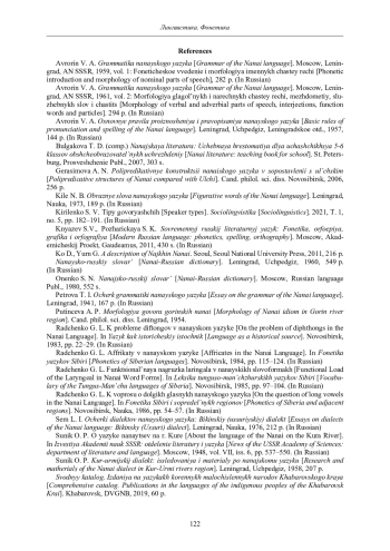 Radchenko G. L. Funktsional’naya nagruzka laringala v nanayskikh slovoformakh [Functional Load of the Laryngeal in Nanai Word Forms]. In Leksika tunguso-man’chzhurskikh yazykov Sibiri [Vocabulary of the Tungus-Man’chu languages of Siberia]. Novosibirsk, 1985, pp. 97-104. (In Russian).