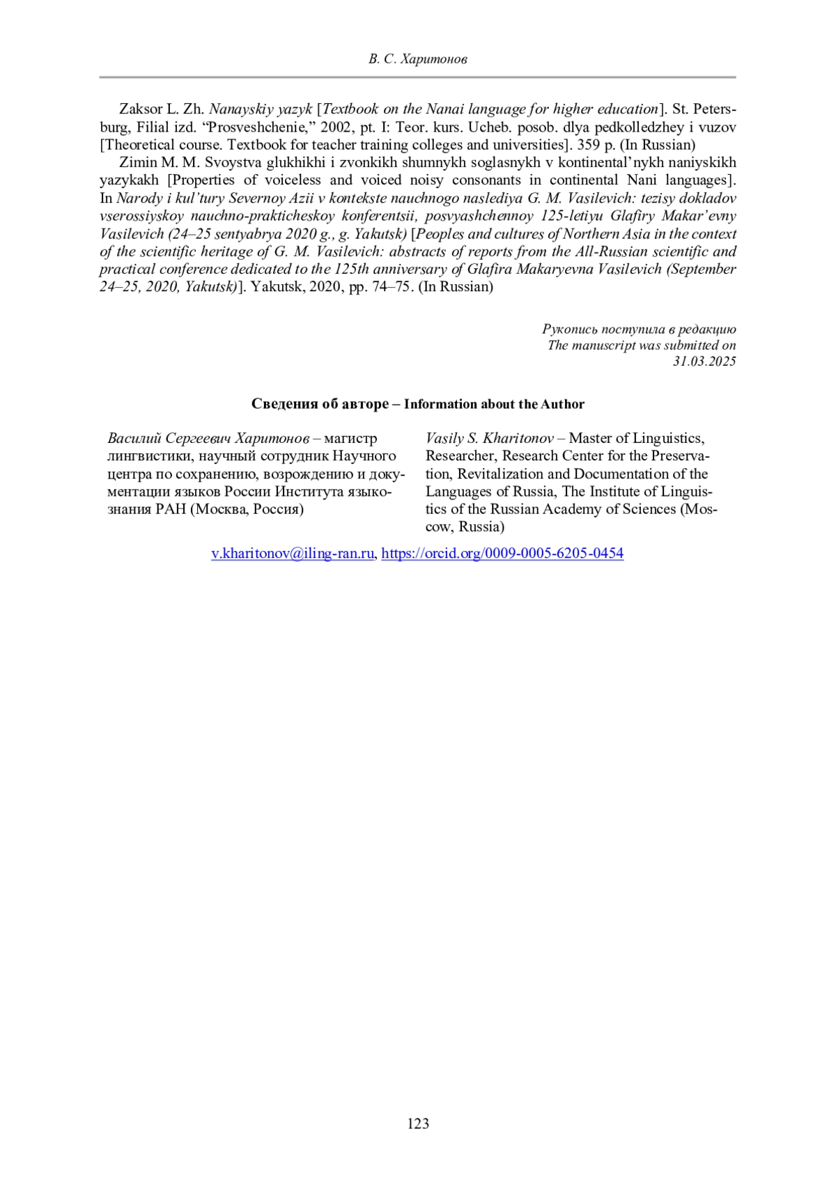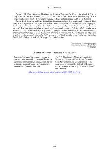 Zimin M. M. Svoystva glukhikhi i zvonkikh shumnykh soglasnykh v kontinental’nykh naniyskikh yazykakh [Properties of voiceless and voiced noisy consonants in continental Nani languages]. In Narody i kul’tury Severnoy Azii v kontekste nauchnogo naslediya G. M. Vasilevich: tezisy dokladov vserossiyskoy nauchno-prakticheskoy konferentsii, posvyashchennoy 125-letiyu Glafiry Makar’evny Vasilevich (24-25 sentyabrya 2020 g., g. Yakutsk) [Peoples and cultures of Northern Asia in the context of the scientific heritage of G. M. Vasilevich: abstracts of reports from the All-Russian scientific and practical conference dedicated to the 125th anniversary of Glafira Makaryevna Vasilevich (September 24-25, 2020, Yakutsk)]. Yakutsk, 2020, pp. 74-75. (In Russian).