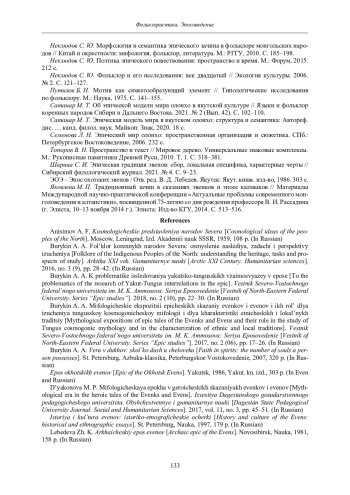 26. Шарина С. И. Эпическая традиция эвенов: сбор, локальная специфика, характерные черты // Сибирский филологический журнал. 2021. № 4. С. 9-23.
