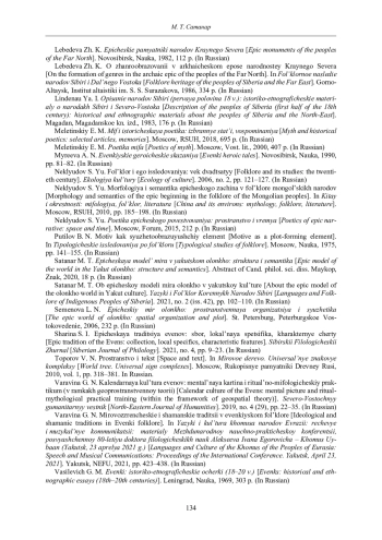 Lebedeva Zh. K. O zhanroobrazovanii v arkhaicheskom epose narodnostey Kraynego Severa [On the formation of genres in the archaic epic of the peoples of the Far North]. In Fol’klornoe nasledie narodov Sibiri i Dal’nego Vostoka [Folklore heritage of the peoples of Siberia and the Far East]. Gorno-Altaysk, Institut altaistiki im. S. S. Surazakova, 1986, 334 p. (In Russian).