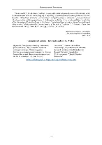 Yakovleva M. P. Traditsionnyy zachin v skazaniyakh evenkov i epose kalmykov [Traditional introduction in Evenk tales and Kalmyk epics]. In Materialy Mezhdunarodnoy nauchno-prakticheskoy konferentsii “Aktual’nye problemy sovremennogo mongolovedeniya i altaistiki”, posvyashchennoy 75-letiyu so dnya rozhdeniya professora V. I. Rassadina (g. Elista, 10-13 noyabrya 2014 g.) [Materials of the International Scientific Research Conference “Actual problems of modern Mongolian studies and Altaic studies”, dedicated to the 75th anniversary of the birth of Professor V. I. Rassadin (Elista, November 10-13, 2014)]. Elista, KSU, 2014, pp. 513-516. (In Russian).