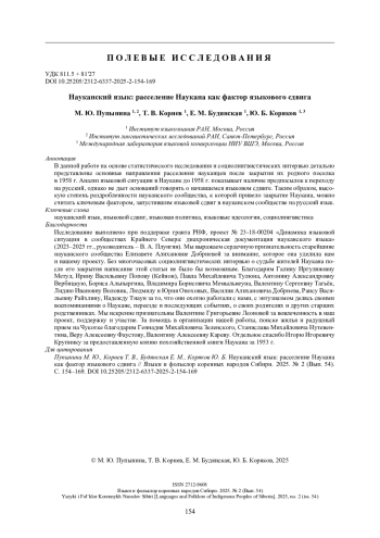 12. Пупынина М. Ю., Коряков Ю. Б. Ареал распространения науканского языка: география многоязычия и динамика контактов // Известия Российской академии наук. Серия литературы и языка. 2024. Т. 83. № 1. С. 45-58.