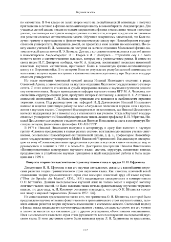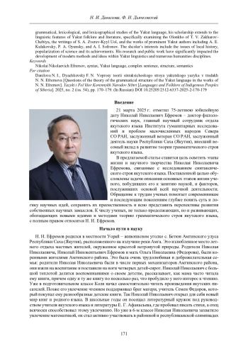 В статье освещаются основные этапы биографии и научной деятельности доктора филологических наук, главного научного сотрудника отдела якутского языка Института проблем малочисленных народов Севера Сибирского отделения РАН, заслуженного деятеля науки Республики Саха (Якутия) Николая Николаевича Ефремова. Становление его как известного ученого-лингвиста неразрывно связано с именами преподавателей кафедры якутского языка Якутского государственного университета и Новосибирской синтаксической школой. Он впервые на материале якутского языка обосновал концепцию о знаковом характере сложного предложения, которое обладает единством плана содержания и плана выражения. Сложные предложения представлены им в форме моделей, репрезентирующих прежде всего их синтаксическое значение.