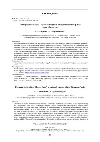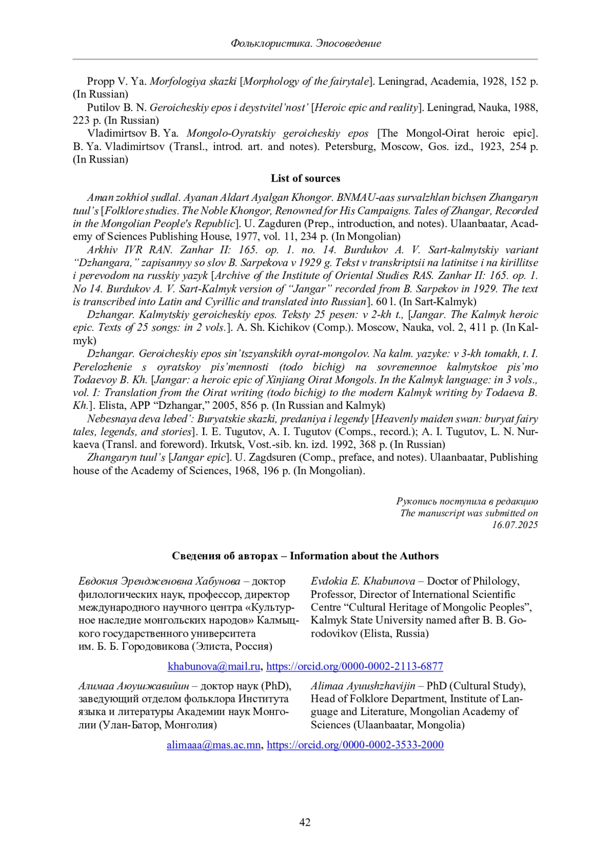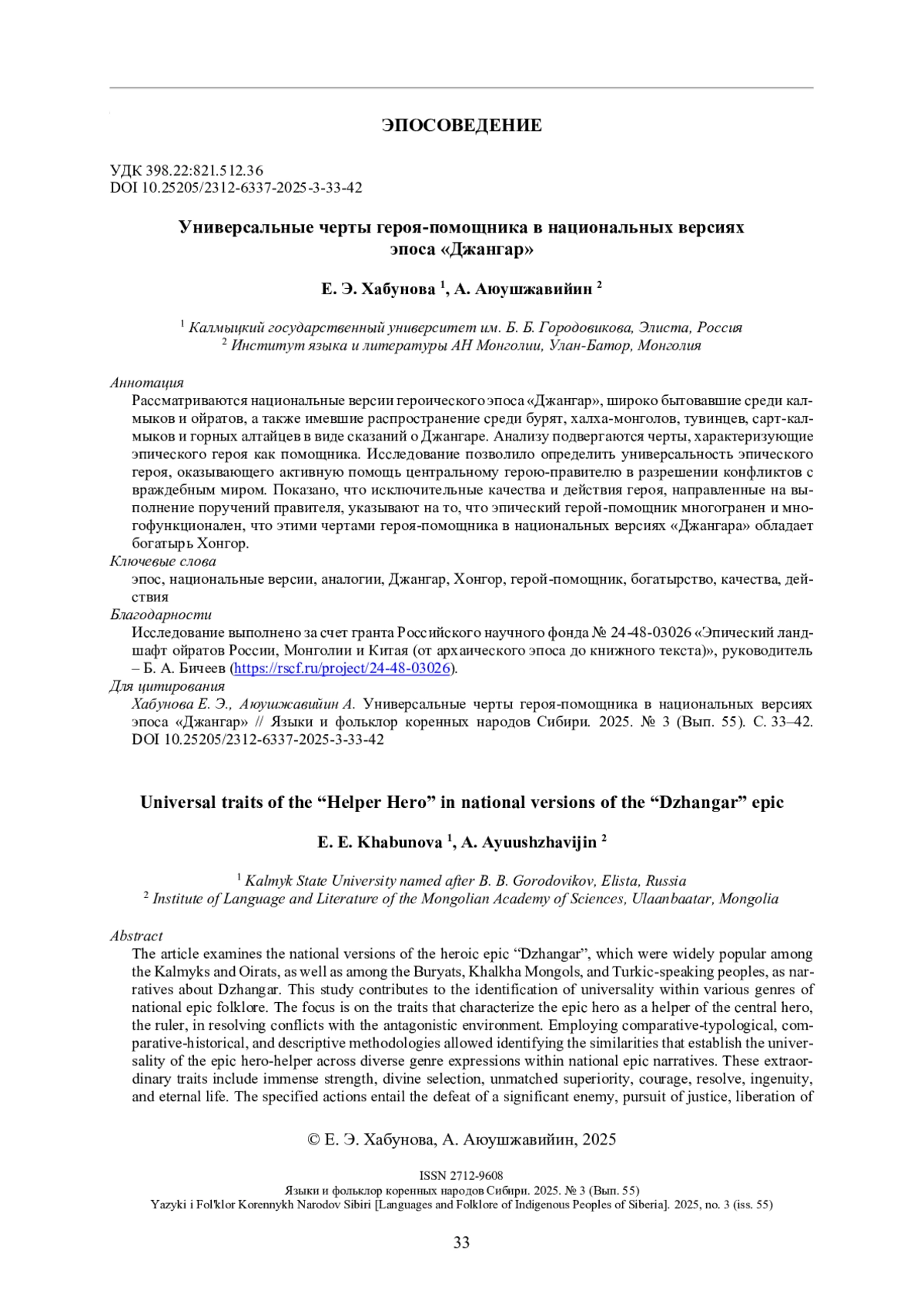 Khabunova E. E., Dampilova L. S., Kungaa M. B., Ayuushzhaviyin A. Tuvinskoe skazanie “Bogda Changar khan” i ego konstantnye segmenty v oyratskoy i kalmytskoy versiyakh geroicheskogo eposa “Dzhangar” [The Tuvan legend “Bogda Changar Khan” and its constant segments in the Oirat and Kalmyk versions of the heroic epic “Jangar”]. Novye issledovaniya Tuvy [The New Research of Tuva]. 2019, no. 4, pp, 109-118. URL: https:// nit.tuva.asia/nit/article/view/887 (accessed 14.07.2025). (In Russian).