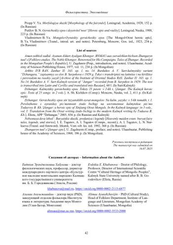 Khabunova E. E. Geroicheskiy epos “Dzhangar”: poeticheskie konstanty bogatyrskogo zhiznennogo tsikla. Sravnitel’noe izuchenie natsional’nykh versiy [The heroic epic “Jangar”: poetic constants of the heroic life cycle (a comparative study of national versions)]. Rostov-on-Don, North Caucasus Scientific Center of Higher School, 2006, 256 p. (In Russian).