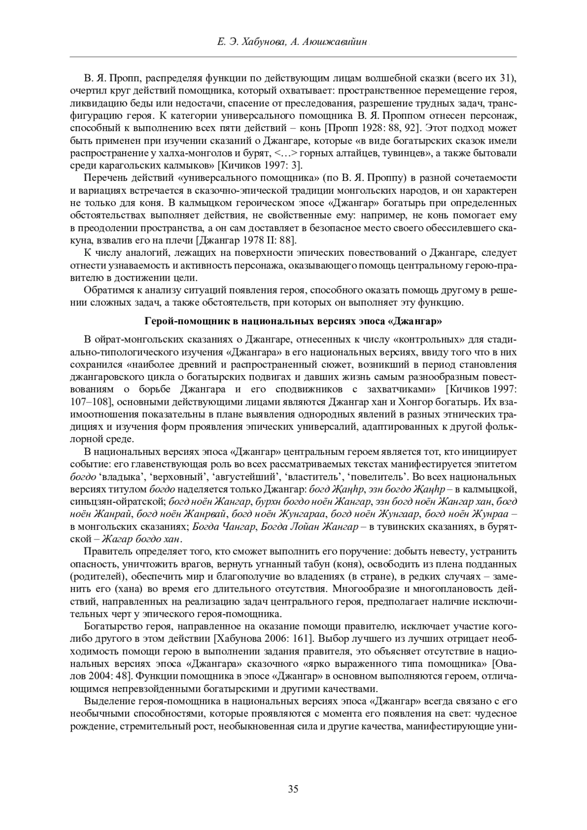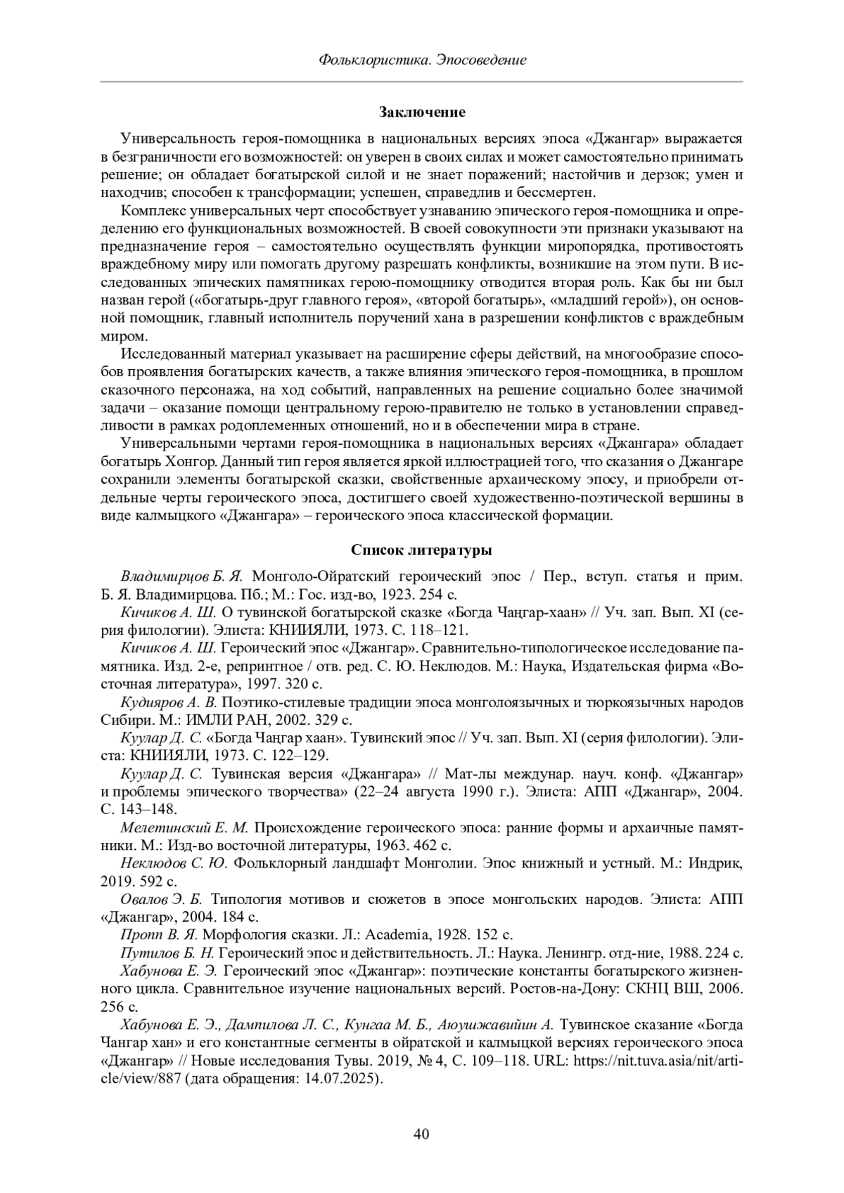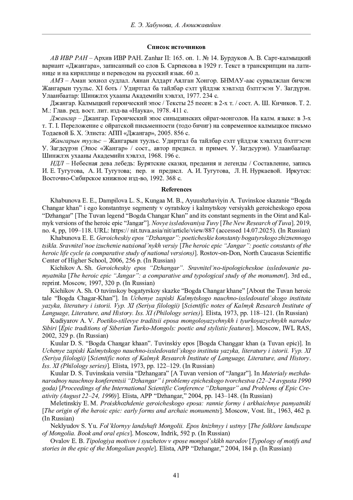 13. Хабунова Е. Э., Дампилова Л. С., Кунгаа М. Б., Аюушжавийин А. Тувинское сказание “Богда Чангар хан” и его константные сегменты в ойратской и калмыцкой версиях героического эпоса “Джангар” // Новые исследования Тувы. 2019, № 4, С. 109-118. URL: https://nit.tuva.asia/nit/article/view/887 (дата обращения: 14.07.2025).