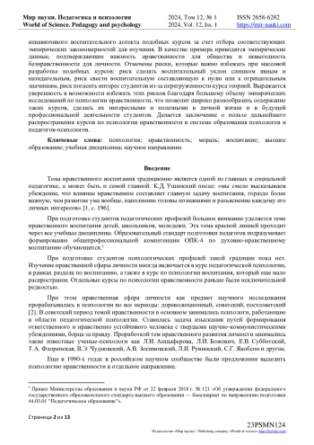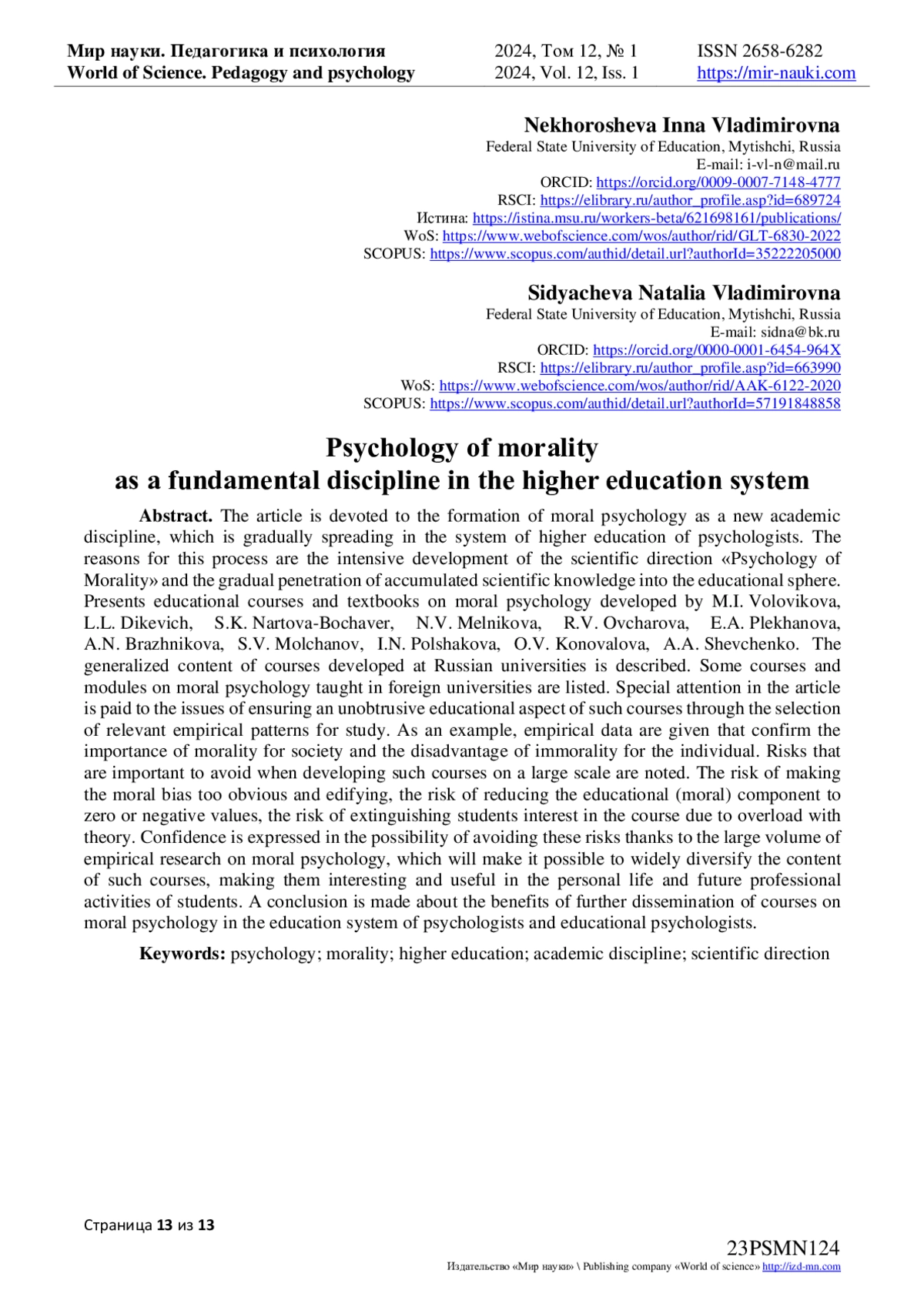 Статья предоставлена авторами. Ссылка для цитирования этой статьи: Нехорошева И. В., Сидячева Н. В. Психология нравственности как основополагающая дисциплина в системе высшего образования // Мир науки. Педагогика и психология. — 2024. — Т. 12. — № 1. — Порядковый номер: 22. DOI: 10.15862/23PSMN124 (https://doi. org/10.15862/23PSMN124) Нехорошева Инна Владимировна ФГАОУ ВО «Государственный университет просвещения», Мытищи, Россия Старший преподаватель кафедры «Социальной и педагогической психологии» Кандидат психологических наук ORCID: https://orcid. org/0009-0007-7148-4777 РИНЦ: https://elibrary. ru/author_profile. asp? id=689724 Истина МГУ: https://istina. msu. ru/workers-beta/621698161/publications/ WoS: https://www. webofscience. com/wos/author/rid/GLT-6830-2022 SCOPUS: https://www. scopus. com/authid/detail. url? authorId=35222205000 Сидячева Наталья Владимировна ФГАОУ ВО «Государственный университет просвещения», Мытищи, Россия Заведующая кафедрой «Социальной и педагогической психологии» Кандидат психологических наук, доцент ORCID: https://orcid. org/0000-0001-6454-964X РИНЦ: https://elibrary. ru/author_profile. asp? id=663990 WoS: https://www. webofscience. com/wos/author/rid/AAK-6122-2020 SCOPUS: https://www. scopus. com/authid/detail. url? authorId=57191848858 Психология нравственности как основополагающая дисциплина в системе высшего образования Аннотация. Статья посвящена вопросам становления психологии нравственности как новой учебной дисциплины, которая постепенно распространяется в системе высшего образования психологов. Причины отмеченного процесса заключаются в интенсивном развитии научного направления «Психология нравственности» и в постепенном проникновении накопленных научных знаний в образовательную сферу. Представлены учебные курсы и учебные пособия по психологии нравственности, разработанные М. И. Воловиковой, Л. Л. Дикевич, С. К. Нартовой-Бочавер, Н. В. Мельниковой, Р. В. Овчаровой, Е. А. Плехановой, А. Н. Бражниковой, С. В. Молчановым, И. Н. Польшаковой, О. В. Коноваловой, А. А. Шевченко. Описано обобщенное содержание курсов, разработанных в российских университетах. Перечислены некоторые курсы и модули по психологии морали и нравственности, читаемые в зарубежных университетах. Отдельное внимание в статье уделяется вопросам обеспечения ненавязчивого воспитательного аспекта подобных курсов за счет отбора соответствующих эмпирических закономерностей для изучения. В качестве примера приводятся эмпирические данные, подтверждающие важность нравственности для общества и невыгодность безнравственности для личности. Отмечены риски, которые важно избежать при массовой разработке подобных курсов: риск сделать воспитательный уклон слишком явным и назидательным, риск свести воспитательную составляющую к нулю или к отрицательным значениям, риск погасить интерес студентов из-за перегруженности курса теорией. Выражается уверенность в возможности избежать этих рисков благодаря большому объему эмпирических исследований по психологии нравственности, что позволит широко разнообразить содержание таких курсов, сделать их интересными и полезными в личной жизни и в будущей профессиональной деятельности студентов. Делается заключение о пользе дальнейшего распространения курсов по психологии нравственности в системе образования психологов и педагогов-психологов. Ключевые слова: психология, нравственность, мораль, воспитание, высшее образование, учебная дисциплина, научное направление. Введение Тема нравственного воспитания традиционно является одной из гл
