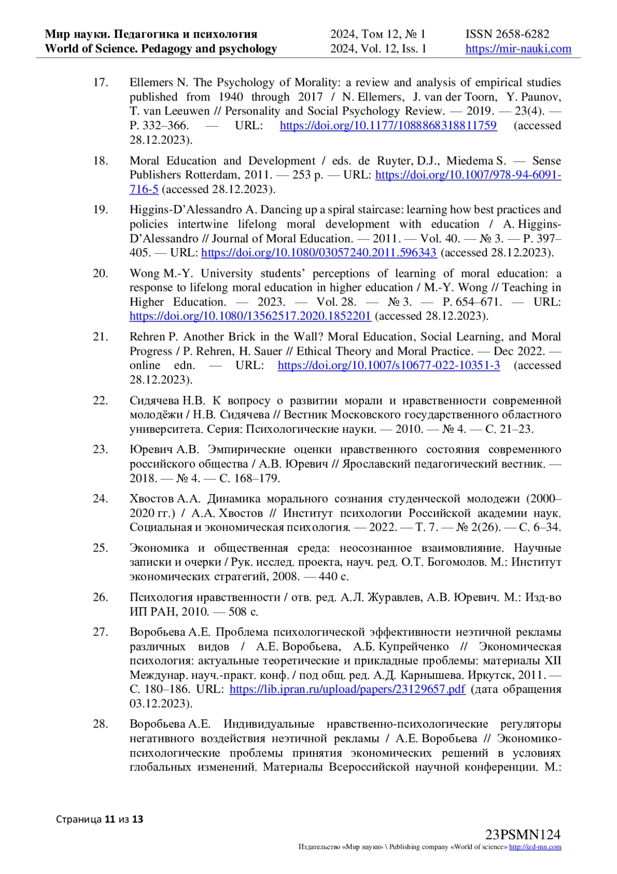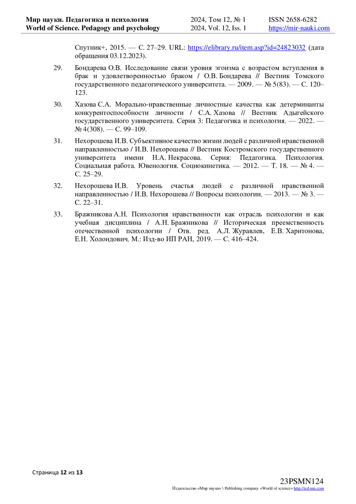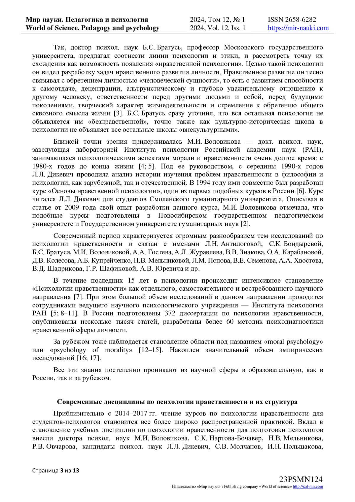 Нехорошева И.В., Сидячева Н.В. Психология нравственности как основополагающая дисциплина в системе высшего образования // Мир науки. Педагогика и психология. — 2024. — Т. 12. — № 1. — Порядковый номер: 22. DOI: 10.15862/23PSMN124 (https://doi.org/10.15862/23PSMN124)