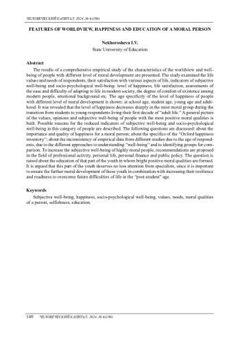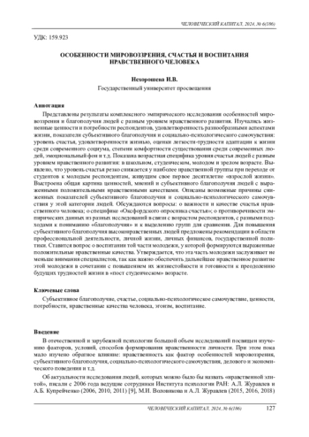 Нехорошева, И. В. Особенности мировоззрения, счастья и воспитания нравственного человека / И. В. Нехорошева // Человеческий капитал. – 2024. – № 6(186). – С. 127-140. – EDN JZYBGJ.