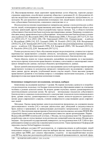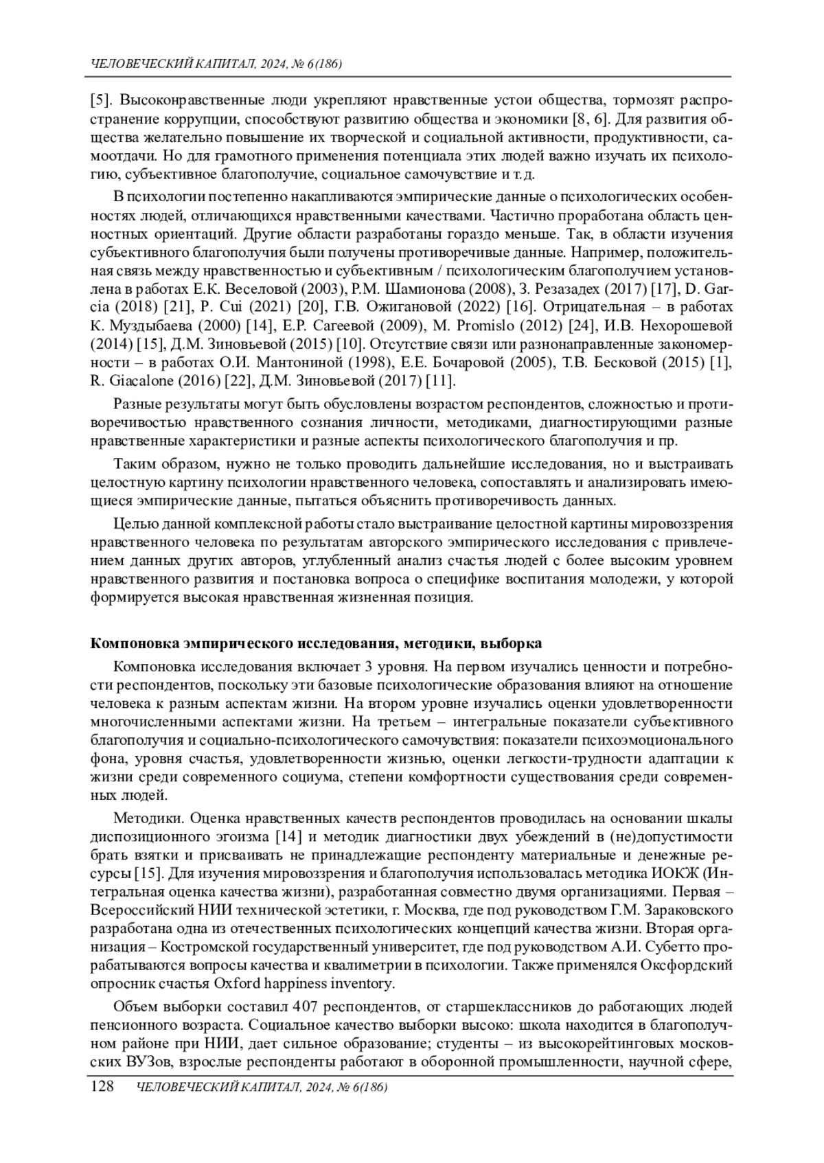 В психологии постепенно накапливаются эмпирические данные о психологических особенностях людей, отличающихся нравственными качествами. Частично проработана область ценностных ориентаций. Другие области разработаны гораздо меньше. Так, в области изучения субъективного благополучия были получены противоречивые данные. Например, положительная связь между нравственностью и субъективным / психологическим благополучием установлена в работах Е. К. Веселовой (2003), Р. М. Шамионова (2008), З. Резазадех (2017) [17], D. Garcia (2018) [21], P. Cui (2021) [20], Г. В. Ожигановой (2022) [16]. Отрицательная – в работах К. Муздыбаева (2000) [14], Е. Р. Сагеевой (2009), M. Promislo (2012) [24], И. В. Нехорошевой (2014) [15], Д. М. Зиновьевой (2015) [10]. Отсутствие связи или разнонаправленные закономерности – в работах О. И. Мантониной (1998), Е. Е. Бочаровой (2005), Т. В. Бесковой (2015) [1], R. Giacalone (2016) [22], Д. М. Зиновьевой (2017) [11].