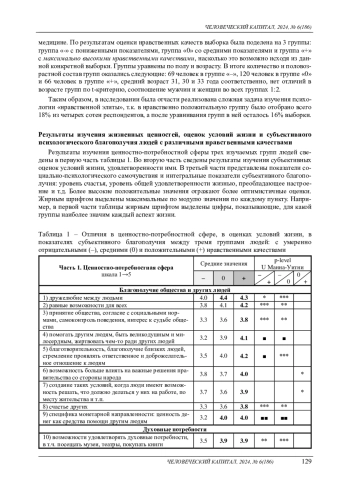 Таблица 1 – Отличия в ценностно-потребностной сфере, в оценках условий жизни, в показателях субъективного благополучия между тремя группами людей: с умеренно отрицательными (–), средними (0) и положительными (+) нравственными качествами.