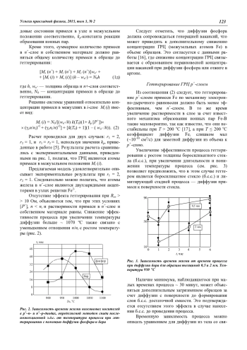 2. Расчеты удовлетворительно описывают экспериментальные результаты при условии, что геттерируемая примесь в n+-слое является двухзарядным акцептором в положении замещения Fe2-. При этом эффективность геттерирования возрастает с ростом концентрации фосфора пропорционально (n/ni)2[P+].