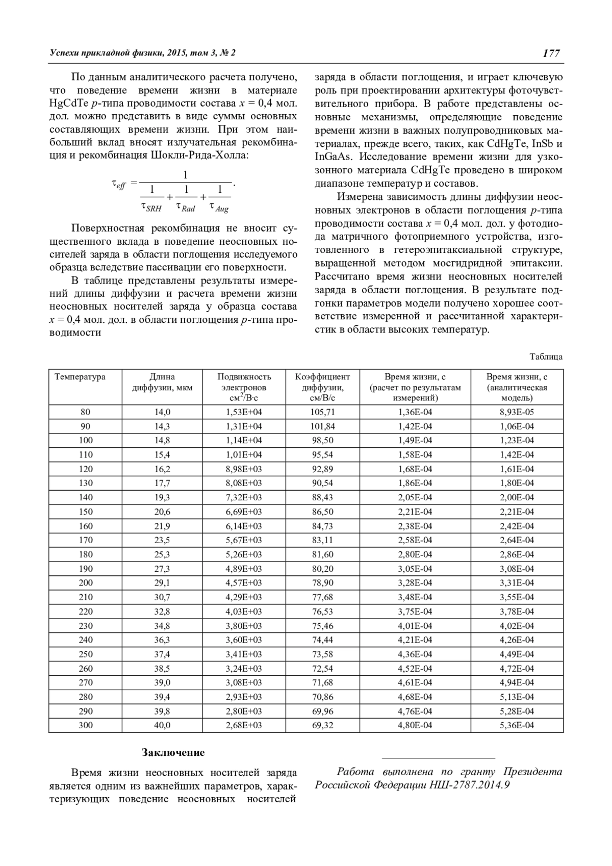 Измерена зависимость длины диффузии неосновных электронов в области поглощения р-типа проводимости состава х = 0,4 мол. дол. у фотодиода матричного фотоприемного устройства, изготовленного в гетероэпитаксиальной структуре, выращенной методом мосгидридной эпитаксии. Рассчитано время жизни неосновных носителей заряда в области поглощения. В результате подгонки параметров модели получено хорошее соответствие измеренной и рассчитанной характеристик в области высоких температур.
