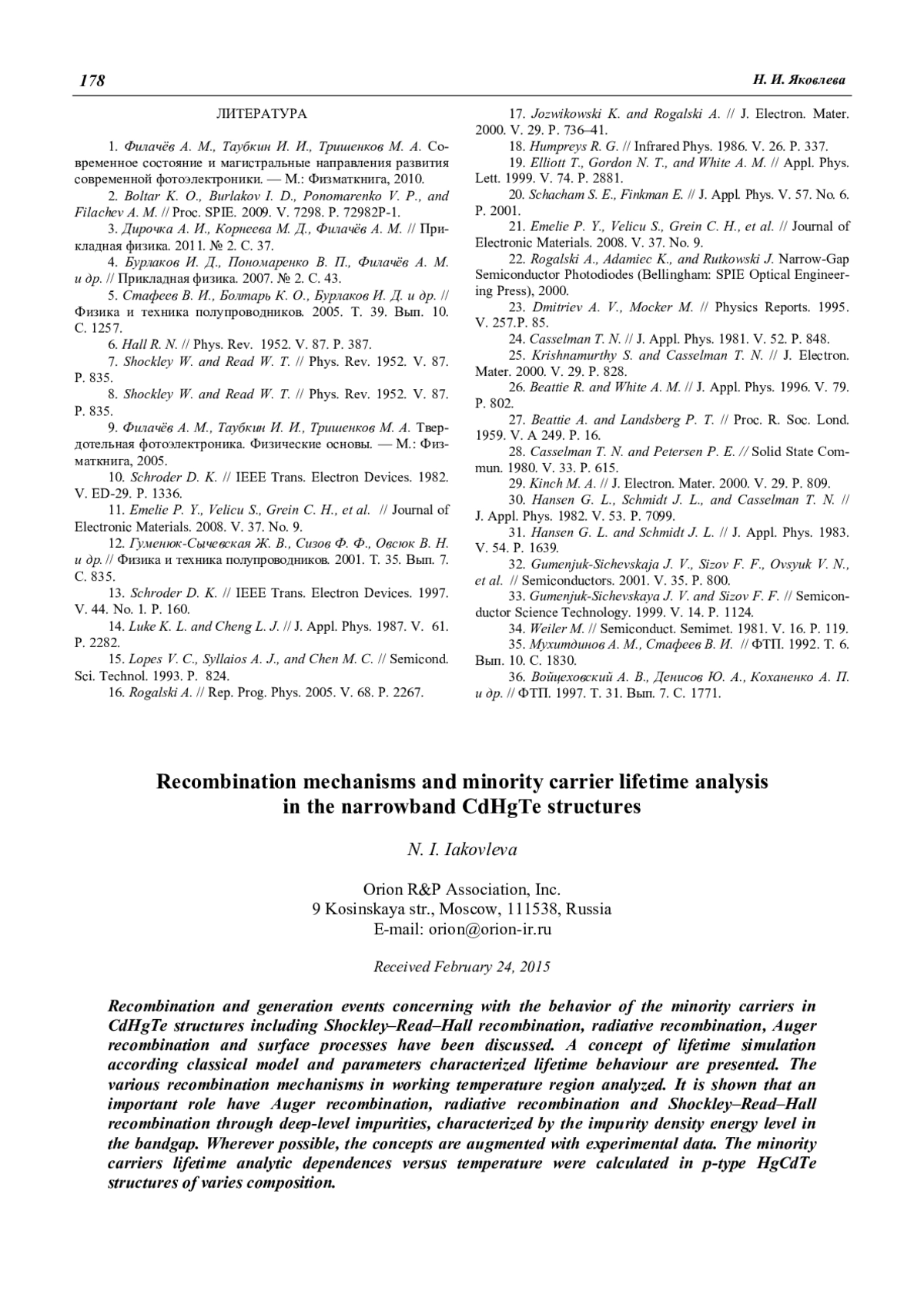 Яковлева Н. И. Процессы рекомбинации и анализ времени жизни в узкозонных полупроводниковых структурах CdHgTe 169