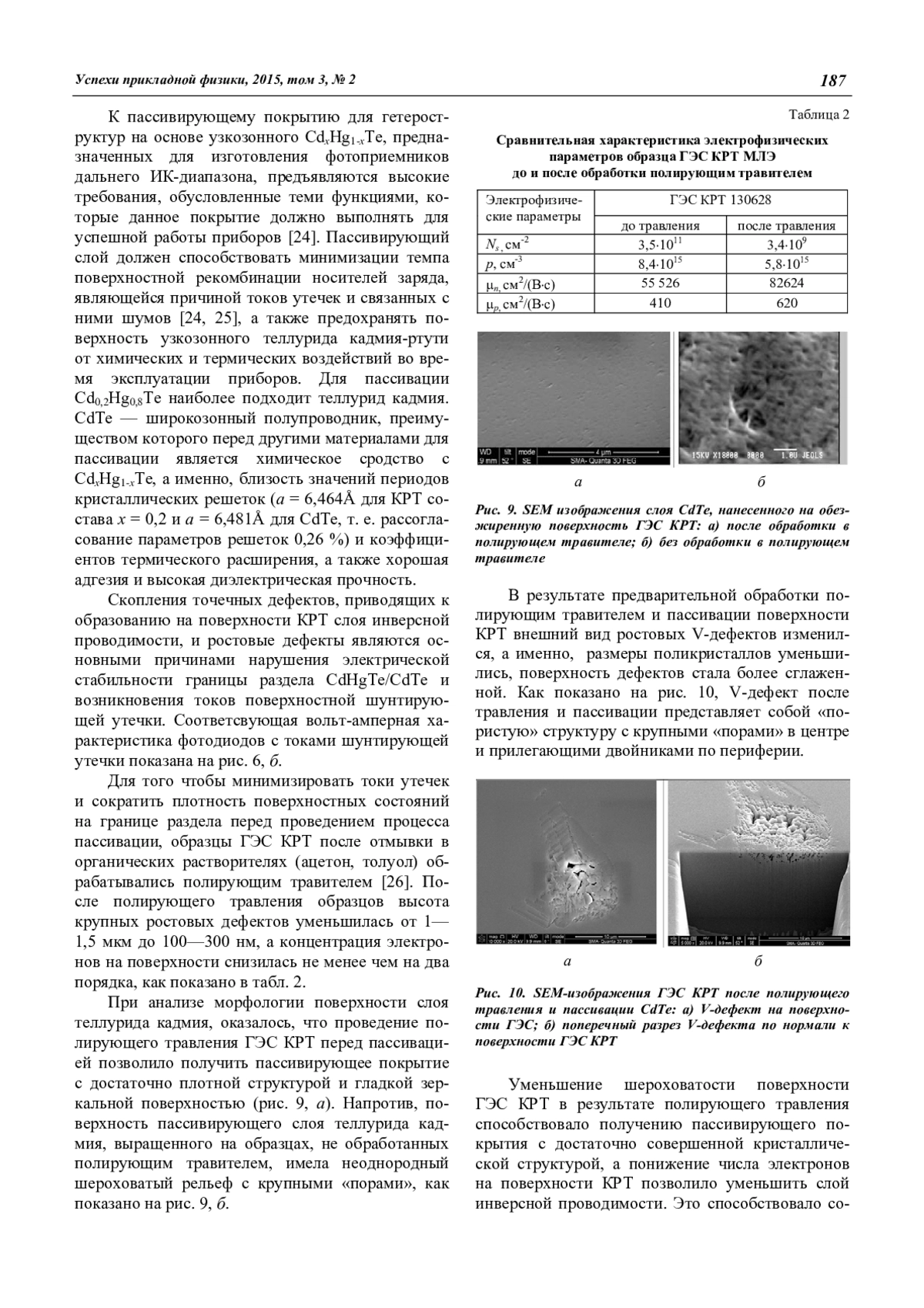 Представлены результаты исследований эпитаксиальных гетероструктур теллурида кадмия-ртути ориентации [310] р-типа проводимости, выращенных молекулярно-лучевой эпитаксией на подложках из арсенида галлия. Исследованы морфология поверхности и электрофизические характеристики ГЭС КРТ. Приведены результаты исследований гетероструктур КРТ после полирующего травления и пассивации поверхности.