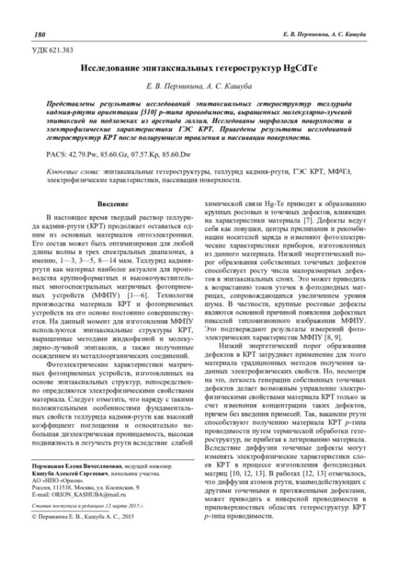Пермикина Е. В., Кашуба А. С. Исследование эпитаксиальных гетероструктур HgCdTe 180