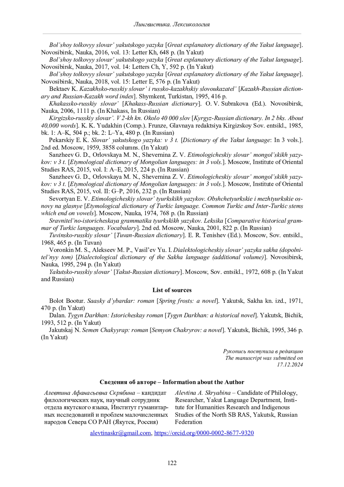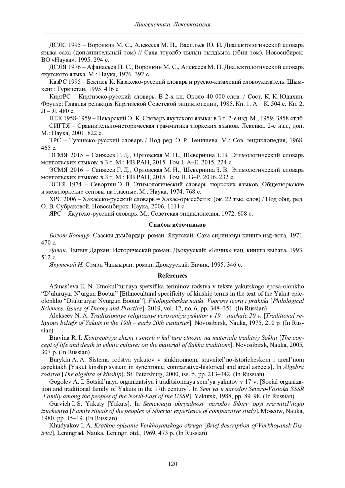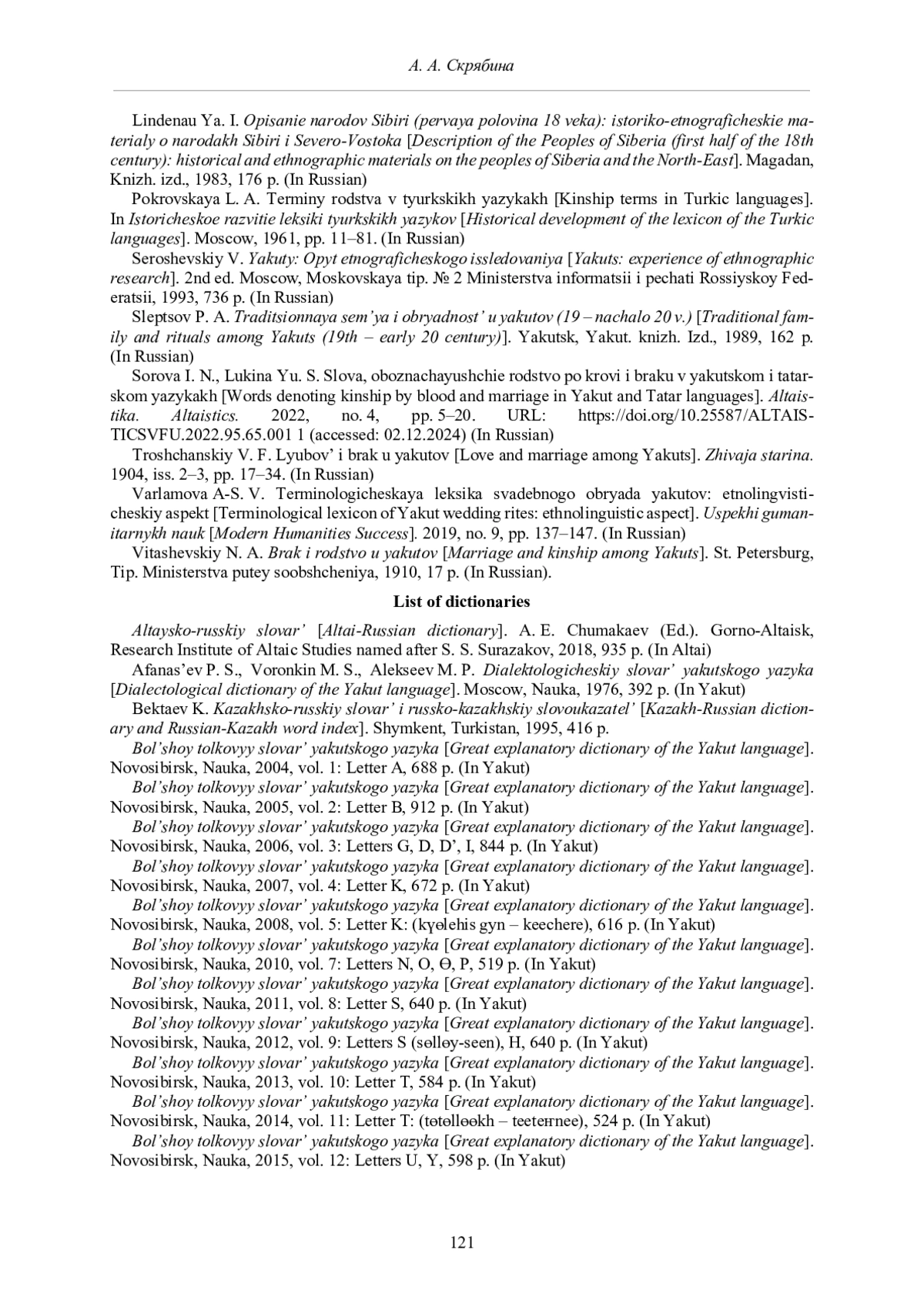 Sorova I. N., Lukina Yu. S. Slova, oboznachayushchie rodstvo po krovi i braku v yakutskom i tatarskom yazykakh [Words denoting kinship by blood and marriage in Yakut and Tatar languages]. Altaistika. Altaistics. 2022, no. 4, pp. 5-20. 10.25587/ALTAIS-TICSVFU.2022.95.65.001 1 (accessed: 02.12.2024) (In Russian). DOI: 10.25587/ALTAIS-TICSVFU.2022.95.65.0011(accessed