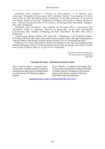 III Sibirskiy forum fol’kloristov: Tezisy dokladov (16-20 iyunya 2025 g., Novosibirsk) [The 3rd Siberian Forum of Folklorists: Abstracts of reports (June 16-20, 2025, Novosibirsk)] E. N. Kuz’mina (Ed.). Institute of Philology SB RAS. Novosibirsk, SB RAS, 2025, 256 p. (In Russian).