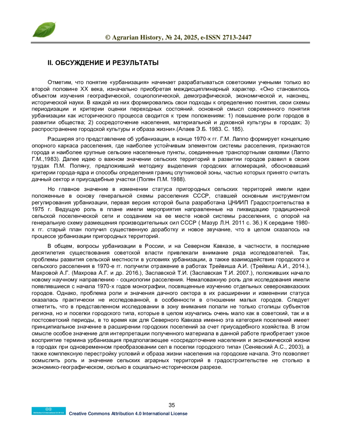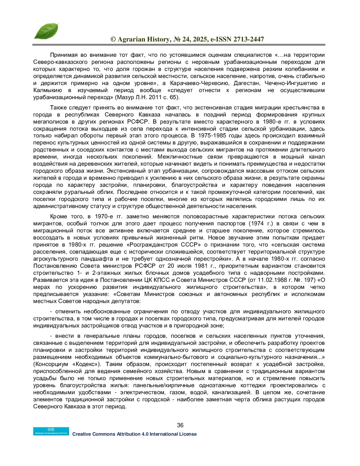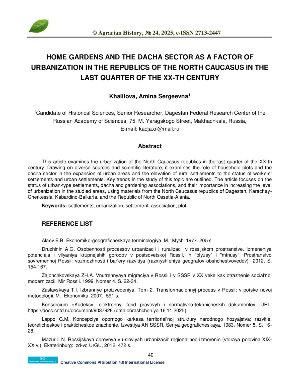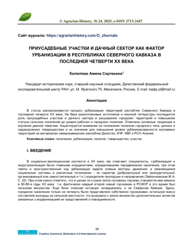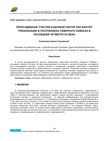 В статье рассматривается процесс урбанизации территорий республик Северного Кавказа в последней четверти ХХ века. На базе разноплановых источников и научной литературы исследуется роль приусадебных участков и дачного сектора в расширении городских территорий и повышении статуса сельских поселений до уровня рабочих и городских поселков. Отмечены основные тенденции в изучении данной тематики. Акцентируется внимание на положении поселков городского типа, дачных и садоводческих товариществах и их значении для повышения уровня урбанизированности изучаемых территорий на материалах северокавказских республик Дагестан, КЧР, КБР и РСО-Алания.