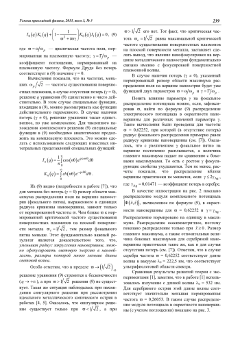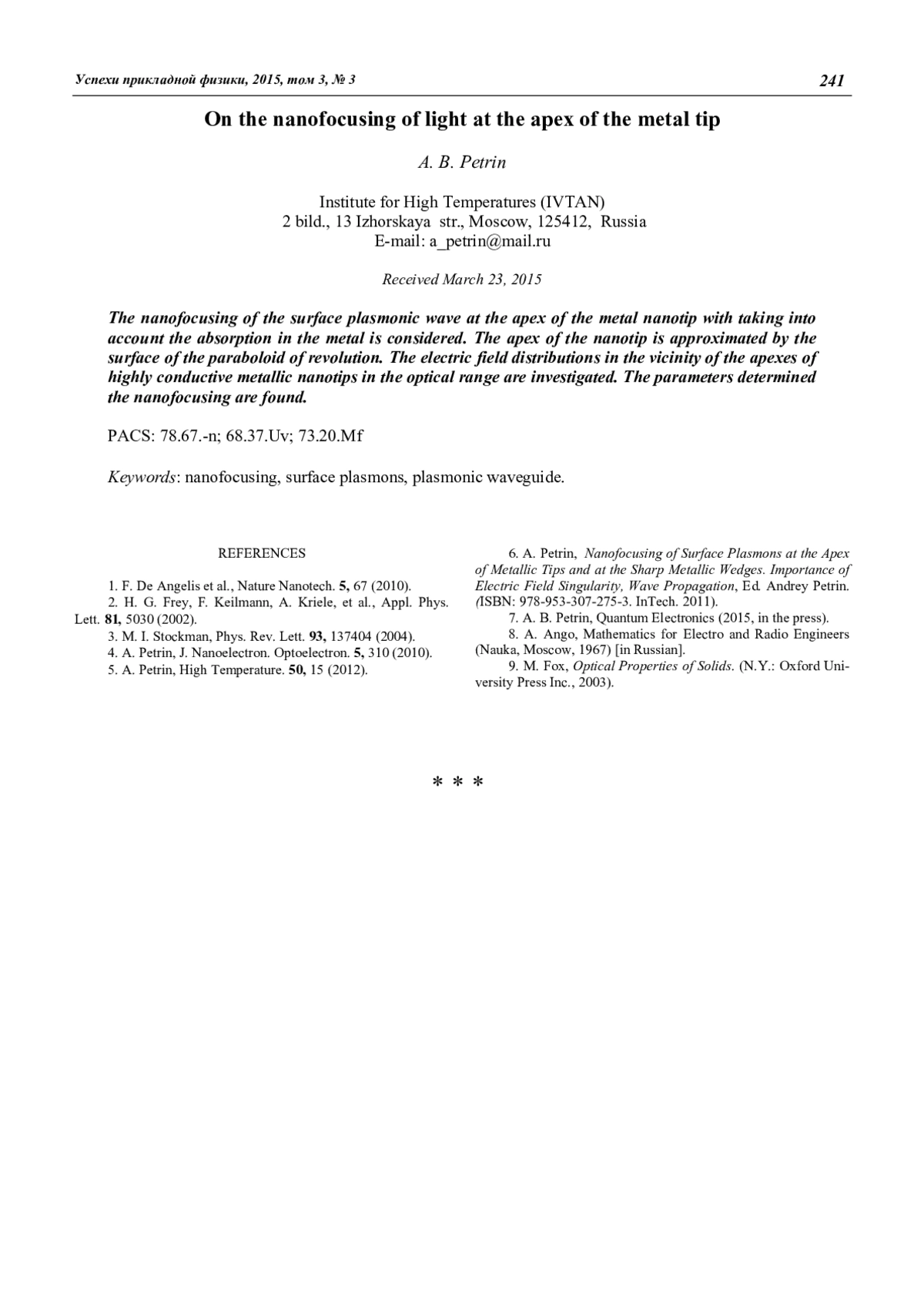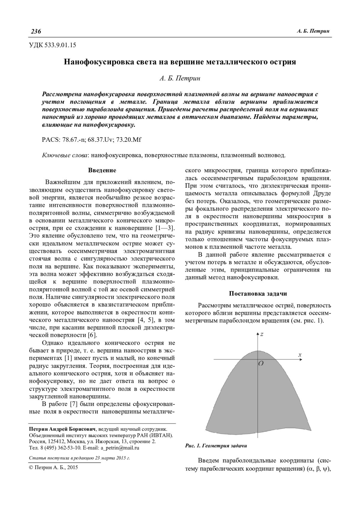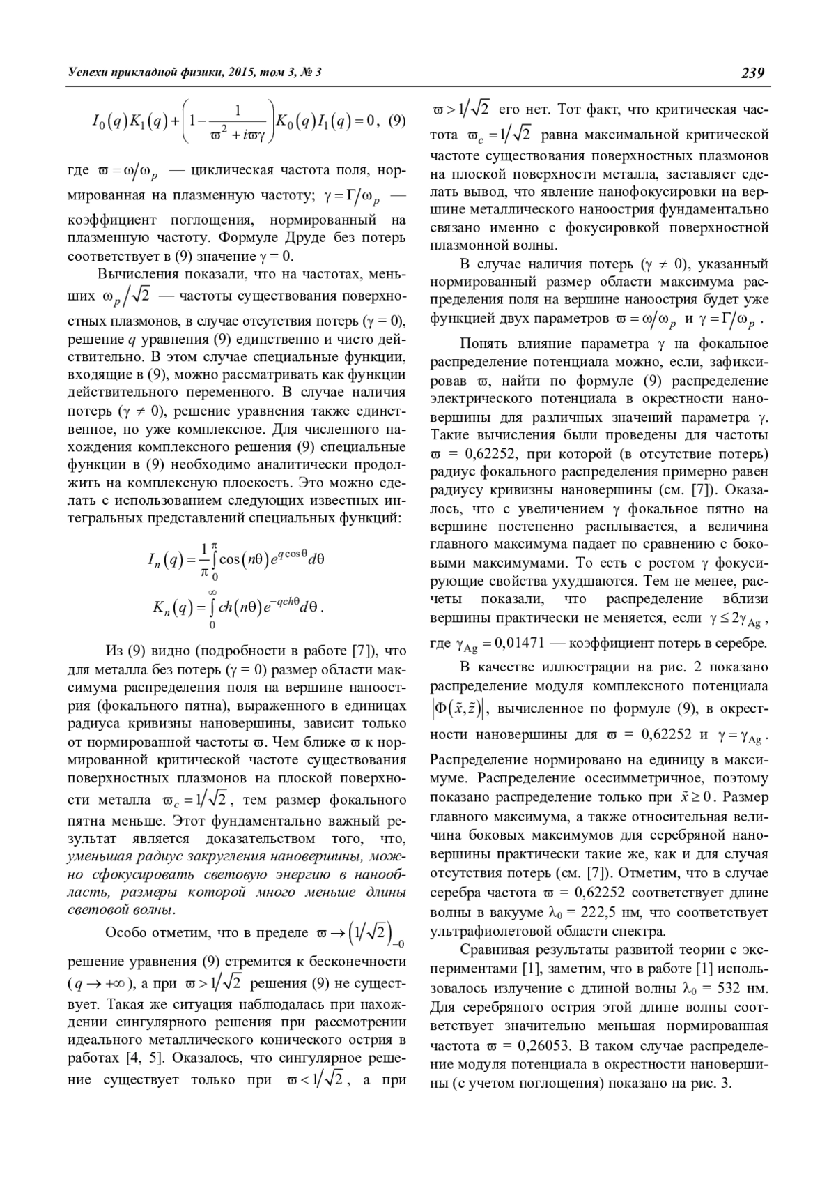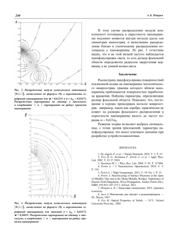 Рассмотрена нанофокусировка поверхностной плазмонной волны на вершине наноострия с учетом поглощения в металле. Граница металла вблизи вершины приближается поверхностью параболоида вращения. Приведены расчеты распределений поля на вершинах нанострий из хорошо проводящих металлов в оптическом диапазоне. Найдены параметры, влияющие на нанофокусировку.