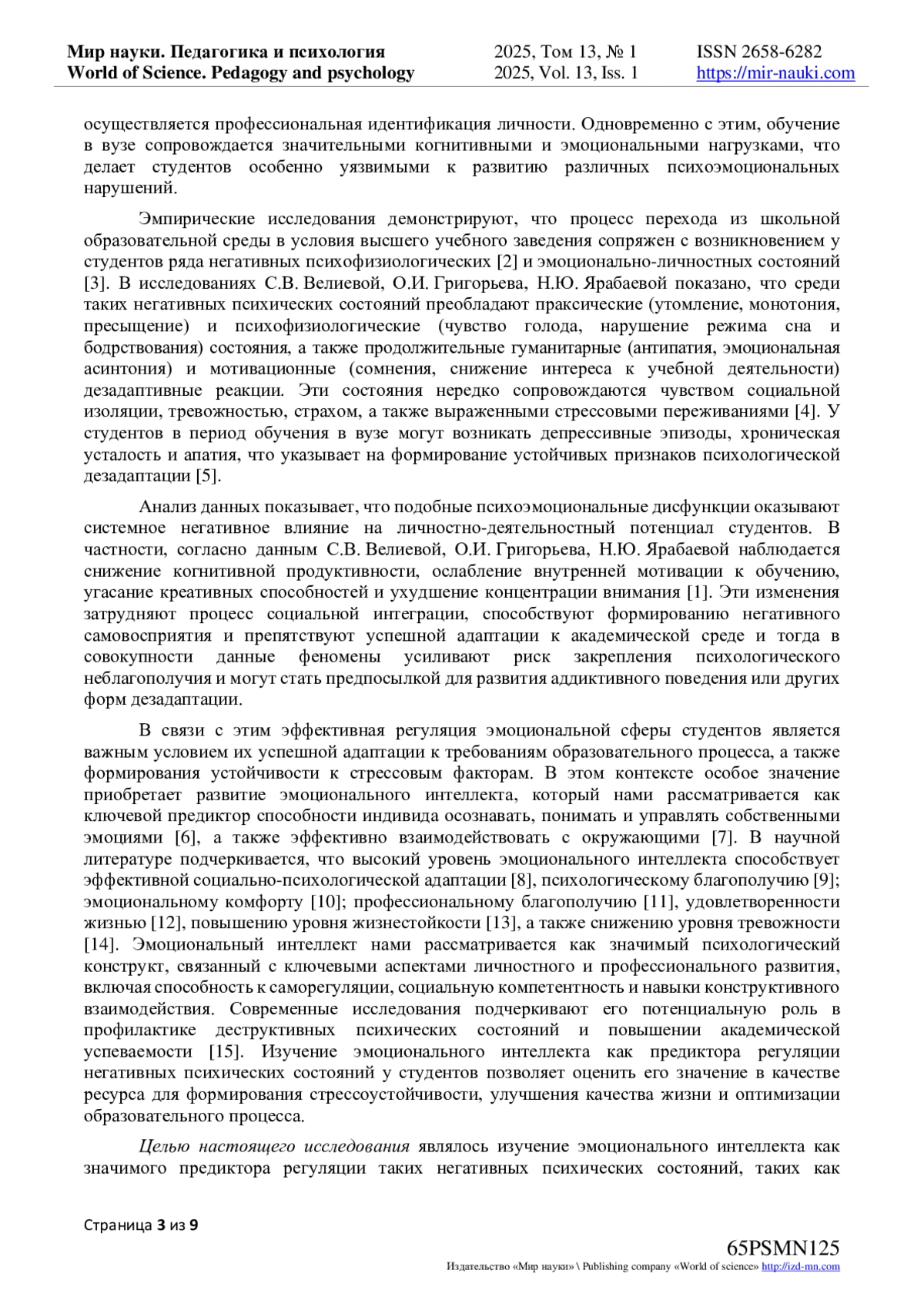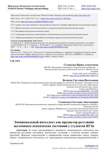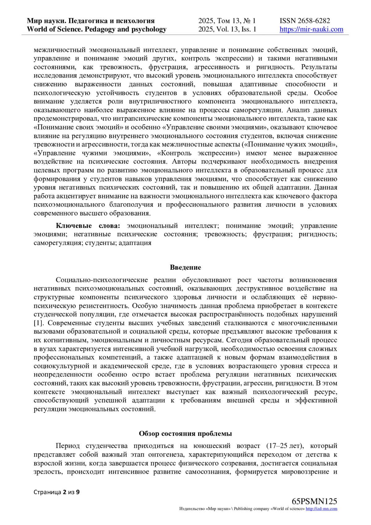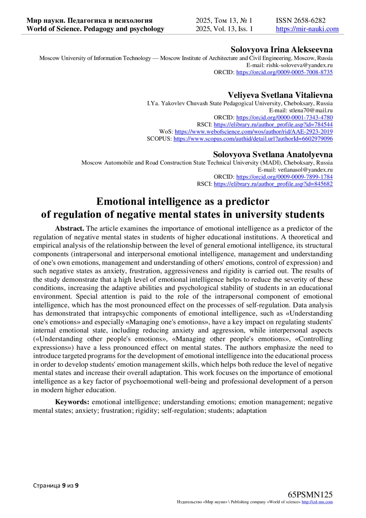 В статье рассматривается значимость эмоционального интеллекта как предиктора регуляции негативных психических состояний у студентов высших учебных заведений. Проведен теоретический и эмпирический анализ взаимосвязи между уровнем общего эмоционального интеллекта, его структурными компонентами (внутриличностный и межличностный эмоциональный интеллект, управление и понимание собственных эмоций, управление и понимание эмоций других, контроль экспрессии) и такими негативными состояниями, как тревожность, фрустрация, агрессивность и ригидность. Результаты исследования демонстрируют, что высокий уровень эмоционального интеллекта способствует снижению выраженности данных состояний, повышая адаптивные способности и психологическую устойчивость студентов в условиях образовательной среды. Особое внимание уделяется роли внутриличностного компонента эмоционального интеллекта, оказывающего наиболее выраженное влияние на процессы саморегуляции. Анализ данных продемонстрировал, что интрапсихические компоненты эмоционального интеллекта, такие как «Понимание своих эмоций» и особенно «Управление своими эмоциями», оказывают ключевое влияние на регуляцию внутреннего эмоционального состояния студентов, включая снижение тревожности и агрессивности, тогда как межличностные аспекты («Понимание чужих эмоций», «Управление чужими эмоциями», «Контроль экспрессии») имеют менее выраженное воздействие на психические состояния. Авторы подчеркивают необходимость внедрения целевых программ по развитию эмоционального интеллекта в образовательный процесс для формирования у студентов навыков управления эмоциями, что способствует как снижению уровня негативных психических состояний, так и повышению их общей адаптации. Данная работа акцентирует внимание на важности эмоционального интеллекта как ключевого фактора психоэмоционального благополучия и профессионального развития личности в условиях современного высшего образования.