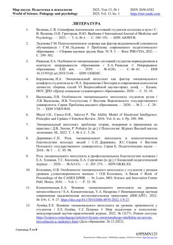 5. Васильева, Л.В. Особенности эмоционального интеллекта студентов вузов / Л.В. Васильева, И.В. Толстоухова // Вестник Воронежского государственного университета. Серия: Проблемы высшего образования. - 2020. - № 2. - С. 29-33. EDN: VNDVWH