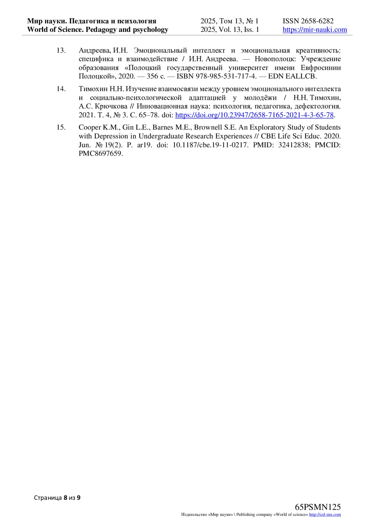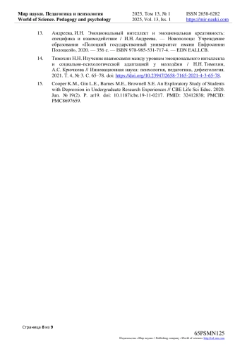 15. Cooper K.M., Gin L.E., Barnes M.E., Brownell S.E. An Exploratory Study of Students with Depression in Undergraduate Research Experiences // CBE Life Sci Educ. 2020. Jun. № 19(2). P. ar19. 10.1187/cbe.19-11-0217. PMID: 32412838; PMCID: PMC8697659. DOI: 10.1187/cbe.19-11-0217.;PMCID PMID: 32412838