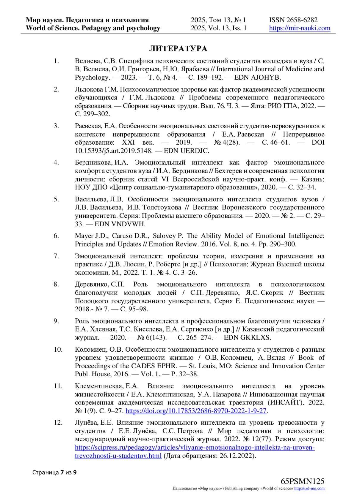 12. Лунёва, Е.Е. Влияние эмоционального интеллекта на уровень тревожности у студентов / Е.Е. Лунёва, С.С. Петрова // Мир педагогики и психологии: международный научно-практический журнал. 2022. № 12(77). Режим доступа: https://scipress.ru/pedagogy/articles/vliyanie-emotsionalnogo-intellekta-na-uroven-trevozhnosti-u-studentov.html (Дата обращения: 26.12.2022).