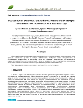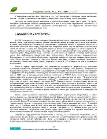 В России в первые годы 90-х годов минувшего столетия произошла коренная перестройка системы собственности, ознаменовавшаяся сменой владельца активов с государства на частных лиц. Данный процесс явился важнейшим этапом экономических реформ, активно осуществлявшихся в стране в последнее десятилетие XX века. Земельные ресурсы, рассматриваемые как территория и основа экономического производства, постепенно переходили в собственность отдельных граждан. Создание правовой базы, регламентирующей оформление прав на земельные участки, осуществлялось на основе разнообразных законов, в том числе земельного и гражданского права, а также нормативных актов, определяющих трансформацию форм собственности предприятий. Преобразование аграрных предприятий в частные структуры играло существенную роль в области управления земельными отношениями и в ходе приватизации. До 2001 года правовое регулирование земельных преобразований происходило преимущественно путем принятия различных нормативных документов. Земли, предназначенные для застройки и развития городских и сельских территорий, классифицировались как земли поселений. Эти земли были отделены от других категорий земель границами соответствующих населенных пунктов.