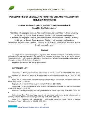 12. Козырь,О.М. Особенности регулирования сделок с землей земельным законодательством. Экологическое право. Номер 4. С. 7 - 16.