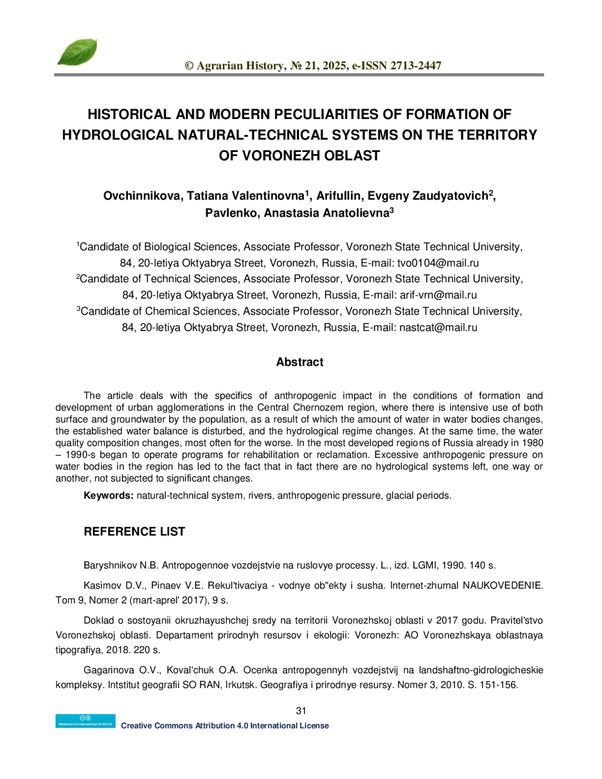 4. Гагаринова О.В., Ковальчук О.А. Оценка антропогенных воздействий на ландшафтно-гидрологические комплексы. Интститут географии СО РАН, Иркутск. География и природные ресурсы. Номер 3, 2010. С. 151-156.