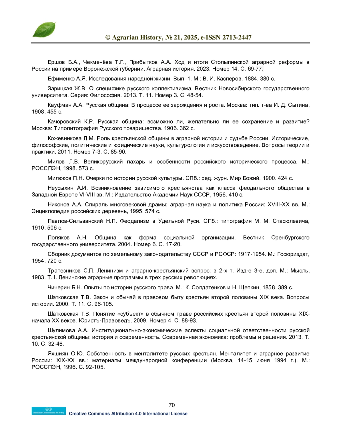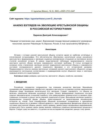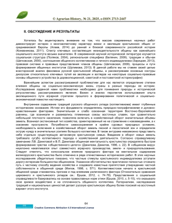 16. Кожевникова Л.М. Роль крестьянской общины в аграрной истории и судьбе России. Исторические, философские, политические и юридические науки, культурология и искусствоведение. Вопросы теории и практики. 2011. Номер 7-3. С. 85-90.