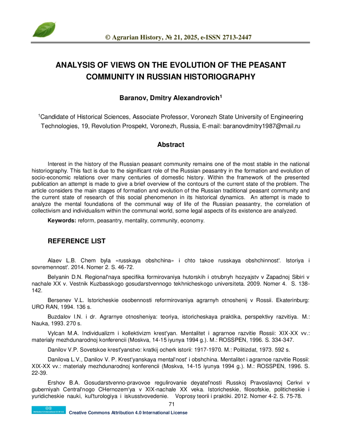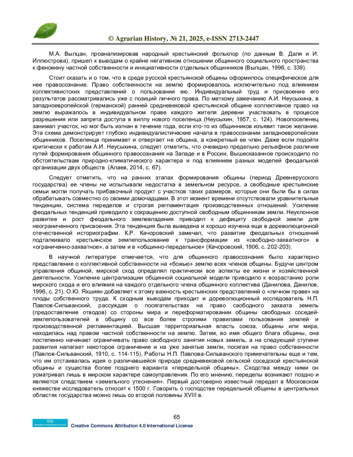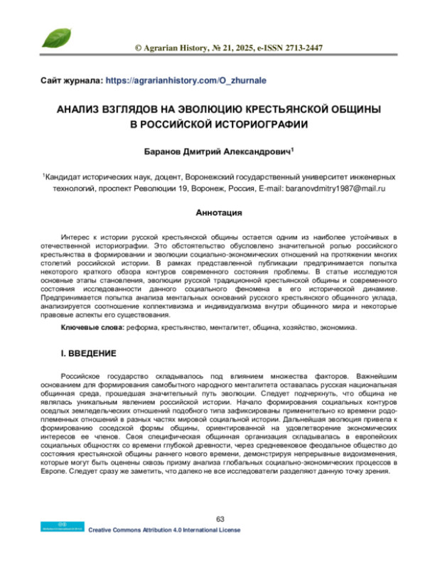 1. Алаев Л.Б. Чем была русская община и что такое русская общинность. История и современность. 2014. Номер 2. С. 46-72.