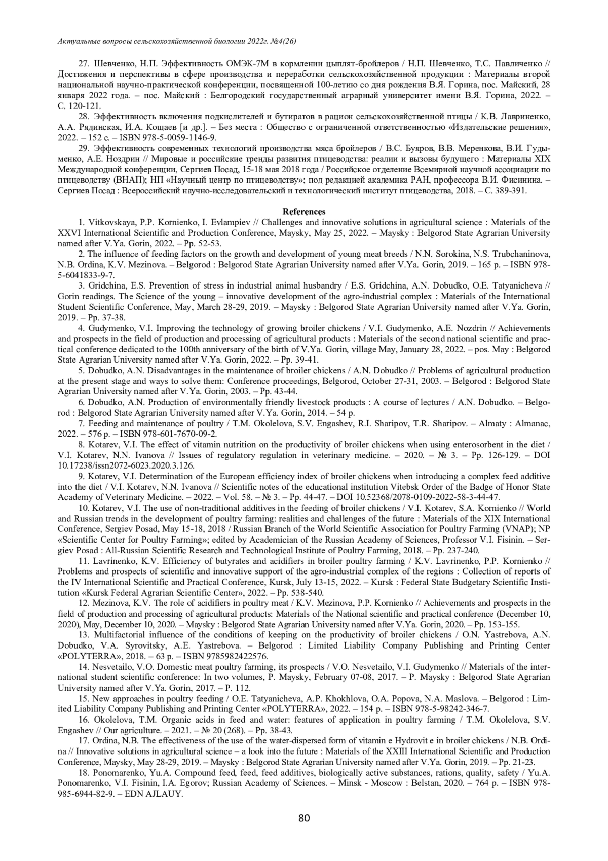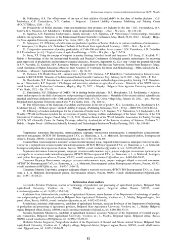 1. Витковская, В.П. Органические вещества как основа рациона сельскохозяйственных животных / В. П. Витковская, П.П. Корниенко, И. Евлампиев // Вызовы и инновационные решения в аграрной науке: Материалы XXVI Международной научно-производственной конференции, Майский, 25 мая 2022 года. - Майский: Белгородский государственный аграрный университет имени В.Я. Горина, 2022. - С. 52-53. EDN: JWZBYM