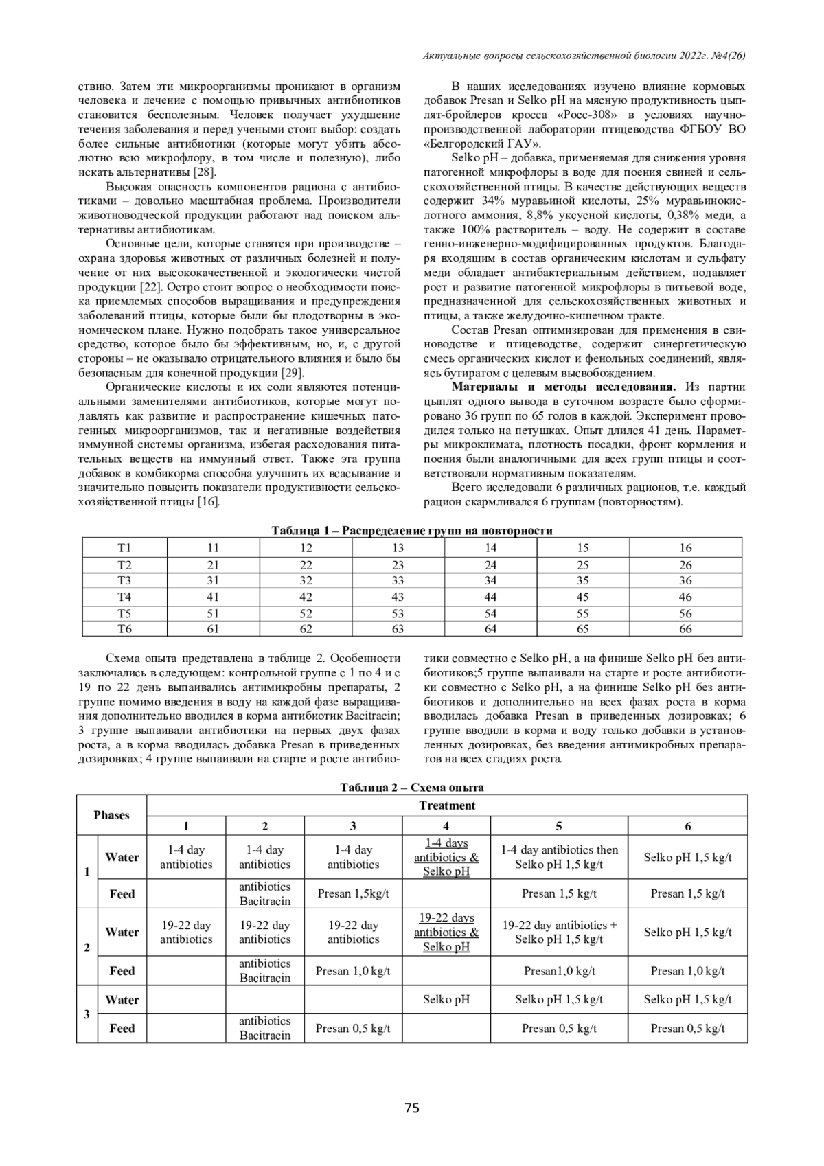 В статье представлены результаты проведенных исследований по включению в рационы кормления цыплят-бройлеров кросса «Росс-308» кормовых добавок «Presan» и «Selko pH», производимых на основе органических кислот. Органические кислоты и их соли используются в птицеводстве как альтернатива кормовых антибиотиков, а также обладают способностью предотвращать развитие кишечной бактериальной инфекции, повышать резистентность организма, тем самым способствуя улучшению усвоения питательных веществ корма и повышению продуктивности птицы. В результате проведенных исследований можно утверждать, что рационы с использованием кормовых добавок Presan и Selko pH (далее КД) повышают эффективность производства цыплят-бройлеров, а именно: повышают сохранность: - использование Selko pH на 2,0%; - использование Presan на 1,8%; - совместное использование КД на 3,5%; - совместное использование КД, без включения антибиотиков, на 2,8%. Снижаются затраты корма: - использование Selko pH на 0,02 ед; - совместное использование КД на 0,01 ед; - совместное использование КД, без включения антибиотиков, на 0,02 ед. Повышают индекс продуктивности: - использование Selko pH на 13 ед. (3,1%); - использование Presan на 8 ед. (1,9%); - совместное использование КД на 17 ед. (4,1%); - совместное использование КД, без включения антибиотиков, на 17 ед. (4,1%). Таким образом, экспериментально доказано, что испытуемые кормовые добавки Presan и Selko pH не снижают убойные показатели бройлеров.
