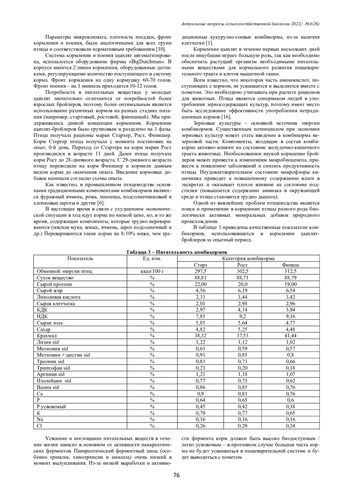Безусловно, успех выращивания и увеличения продуктивности тесно связан с правильным и точно рассчитанным кормлением [1, 13]. Так, для получения 1 кг прироста мяса птицы расход корма варьируется от 1,6 до 1,8 кг [20].