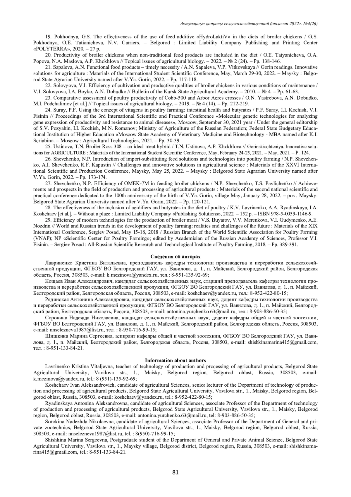26. Шевченко, Н.П. Внедрение в птицеводство импортозамещающих кормовых решений и технологий / Н.П. Шевченко, А.И. Шевченко, Р.Ф. Капустин // Вызовы и инновационные решения в аграрной науке: Материалы XXVI Международной научно-производственной конференции, Майский, 25 мая 2022 года. - Майский: Белгородский государственный аграрный университет имени В.Я. Горина, 2022. - С. 173-174. EDN: ORNDCT