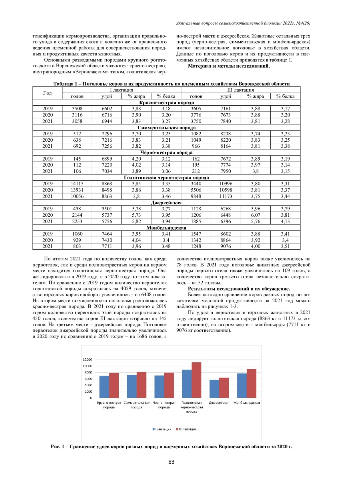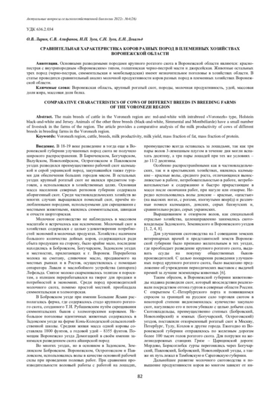 The main breeds of cattle in the Voronezh region are: red-and-white with intrabreed «Voronezh» type, Holstein black-and-white and Jersey. Animals of the other three breeds (black-and-white, Simmental and Montbéliarde) have a small number of livestock in the farms of the region. The article provides a comparative analysis of the milk productivity of cows of different breeds in breeding farms in the Voronezh region.