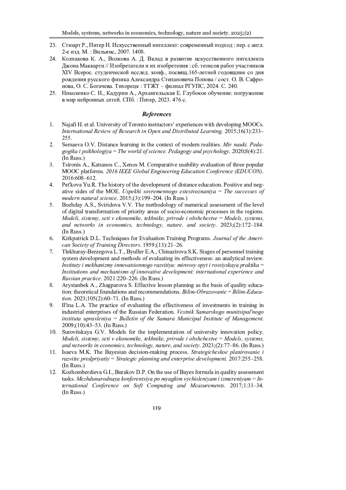 15. Босов А. В., Мартюшова Я. Г., Наумов А. В., Сапунова А. П. Байесовский подход к построению индивидуальной траектории пользователя в системе дистанционного обучения // Информатика и ее применения. 2020. Т. 14, № 3. С. 86-93. EDN: WAKFJR
