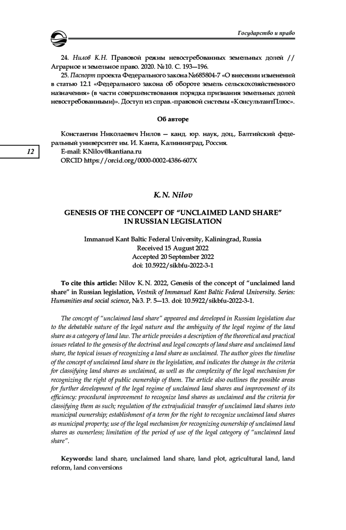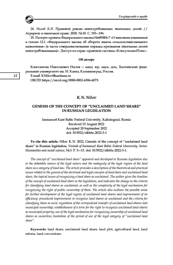 24. Нилов К. Н. Правовой режим невостребованных земельных долей // Аграрное и земельное право. 2020. № 10. С. 193-196. EDN: IZEQCC