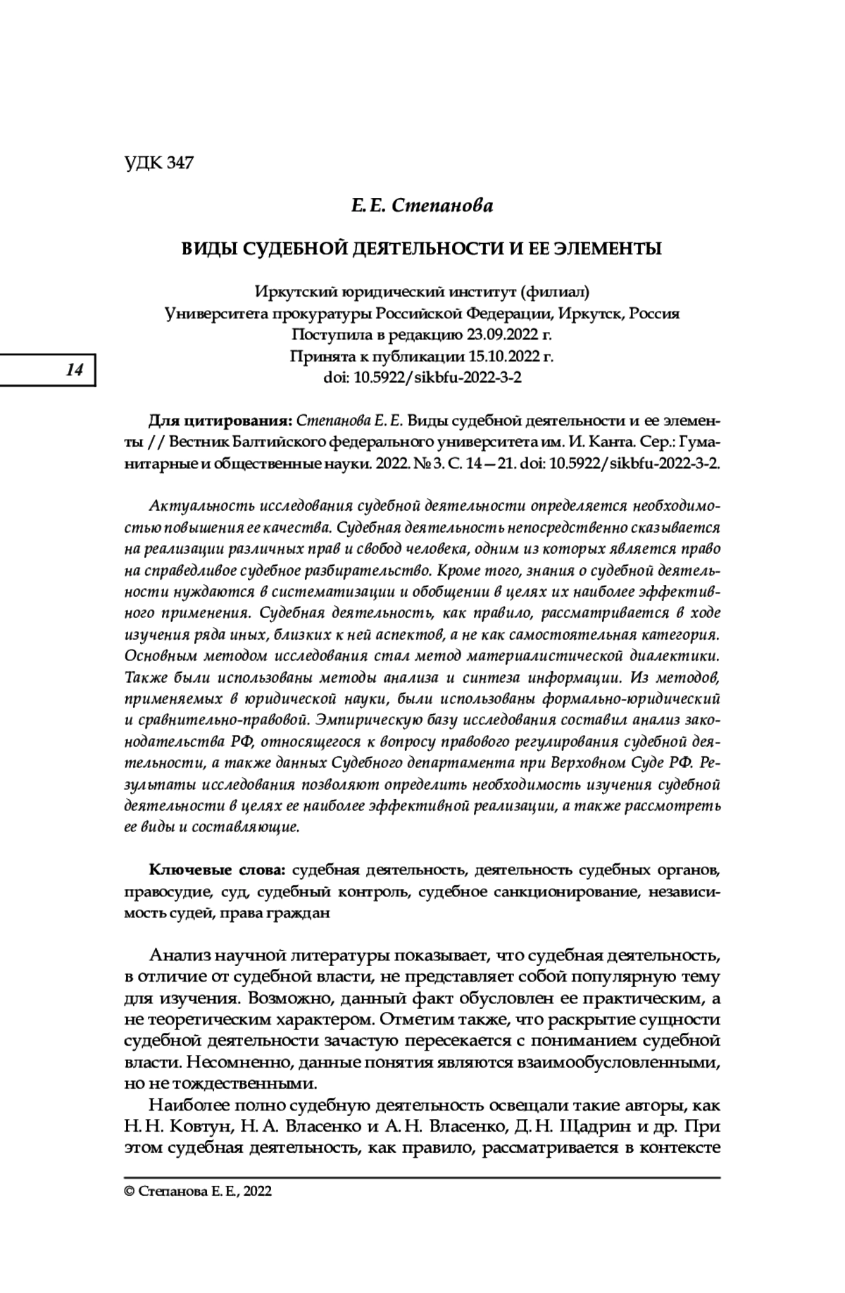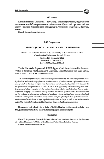 Актуальность исследования судебной деятельности определяется необходимо - стью повышения ее качества. Судебная деятельность непосредственно сказывается на реализации различных прав и свобод человека, одним из которых является право на справедливое судебное разбирательство. Кроме того, знания о судебной деятель - ности нуждаются в систематизации и обобщении в целях их наиболее эффективного применения. Судебная деятельность, как правило, рассматривается в ходе изучения ряда иных, близких к ней аспектов, а не как самостоятельная категория. Основным методом исследования стал метод материалистической диалектики. Также были использованы методы анализа и синтеза информации. Из методов, применяемых в юридической науки, были использованы формально-юридический и сравнительно-правовой. Эмпирическую базу исследования составил анализ законодательства РФ, относящегося к вопросу правового регулирования судебной деятельности, а также данных Судебного департамента при Верховном Суде РФ. Результаты исследования позволяют определить необходимость изучения судебной деятельности в целях ее наиболее эффективной реализации, а также рассмотреть ее виды и составляющие
