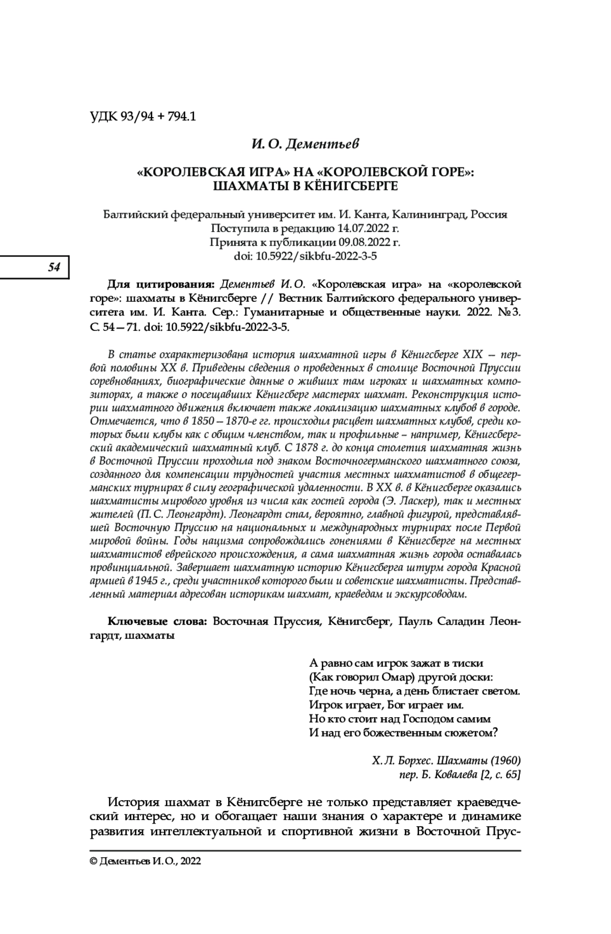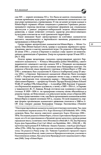 В статье охарактеризована история шахматной игры в Кёнигсберге XIX — первой половины ХХ в. Приведены сведения о проведенных в столице Восточной Пруссии соревнованиях, биографические данные о живших там игроках и шахматных композиторах, а также о посещавших Кёнигсберг мастерах шахмат. Реконструкция истории шахматного движения включает также локализацию шахматных клубов в городе. Отмечается, что в 1850—1870-е гг. происходил расцвет шахматных клубов, среди которых были клубы как с общим членством, так и профильные – например, Кёнигсбергский академический шахматный клуб. С 1878 г. до конца столетия шахматная жизнь в Восточной Пруссии проходила под знаком Восточногерманского шахматного союза, созданного для компенсации трудностей участия местных шахматистов в общегерманских турнирах в силу географической удаленности. В XX в. в Кёнигсберге оказались шахматисты мирового уровня из числа как гостей города (Э. Ласкер), так и местных жителей (П. С. Леонгардт). Леонгардт стал, вероятно, главной фигурой, представлявшей Восточную Пруссию на национальных и международных турнирах после Первой мировой войны. Годы нацизма сопровождались гонениями в Кёнигсберге на местных шахматистов еврейского происхождения, а сама шахматная жизнь города оставалась провинциальной. Завершает шахматную историю Кёнигсберга штурм города Красной армией в 1945 г., среди участников которого были и советские шахматисты. Представленный материал адресован историкам шахмат, краеведам и экскурсоводам