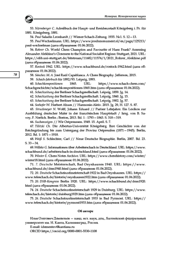 56. Rohrer Ch. World Chess Champion and Favourite of Hans Frank? Assessing Alexander Alekhine’s Closeness to the National Socialist Regime. Stuttgart, 2021. URL: https://elib.uni-stuttgart.de/bitstream/11682/11576/1/2021_Rohrer_Alekhine.pdf (дата обращения: 01.06.2022).