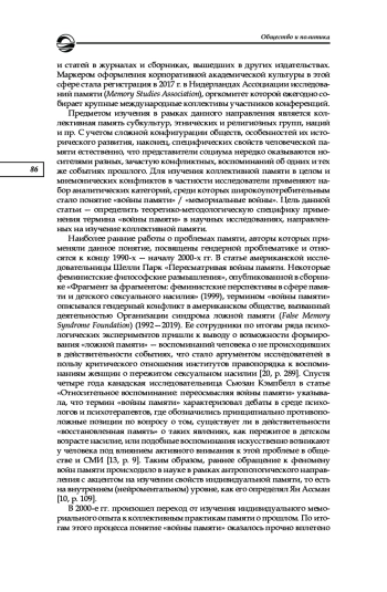 Последние три десятилетия стали временем становления и активного развития в мировой науке нового междисциплинарного направления, тесно связанного с изучением прошлого, — исследований памяти (memory studies). Об этом процессе свидетельствуют учреждение в 2008 г. журнала Memory Studies, появление с 2010 г. специализированной книжной серии Palgrave Macmillan Memory Studies (только в ней к настоящему моменту издано уже 83 монографии, и еще 3 планируются к публикации в течение 2022 г.)
