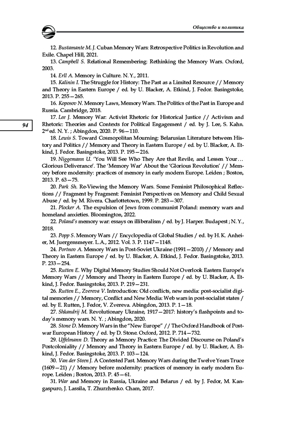 23. Popp S. Memory Wars // Encyclopedia of Global Studies / ed. by H. K. Anheier, M. Juergensmeyer. L.A., 2012. Vol. 3. P. 1147-1148.