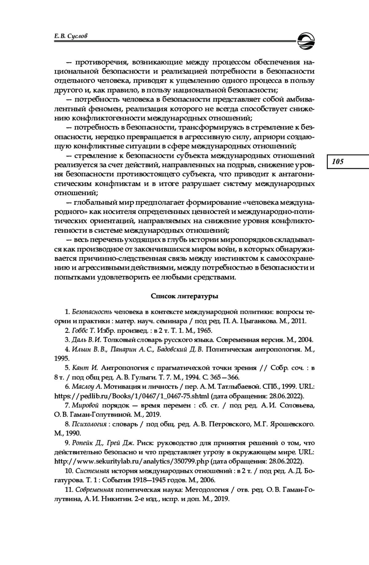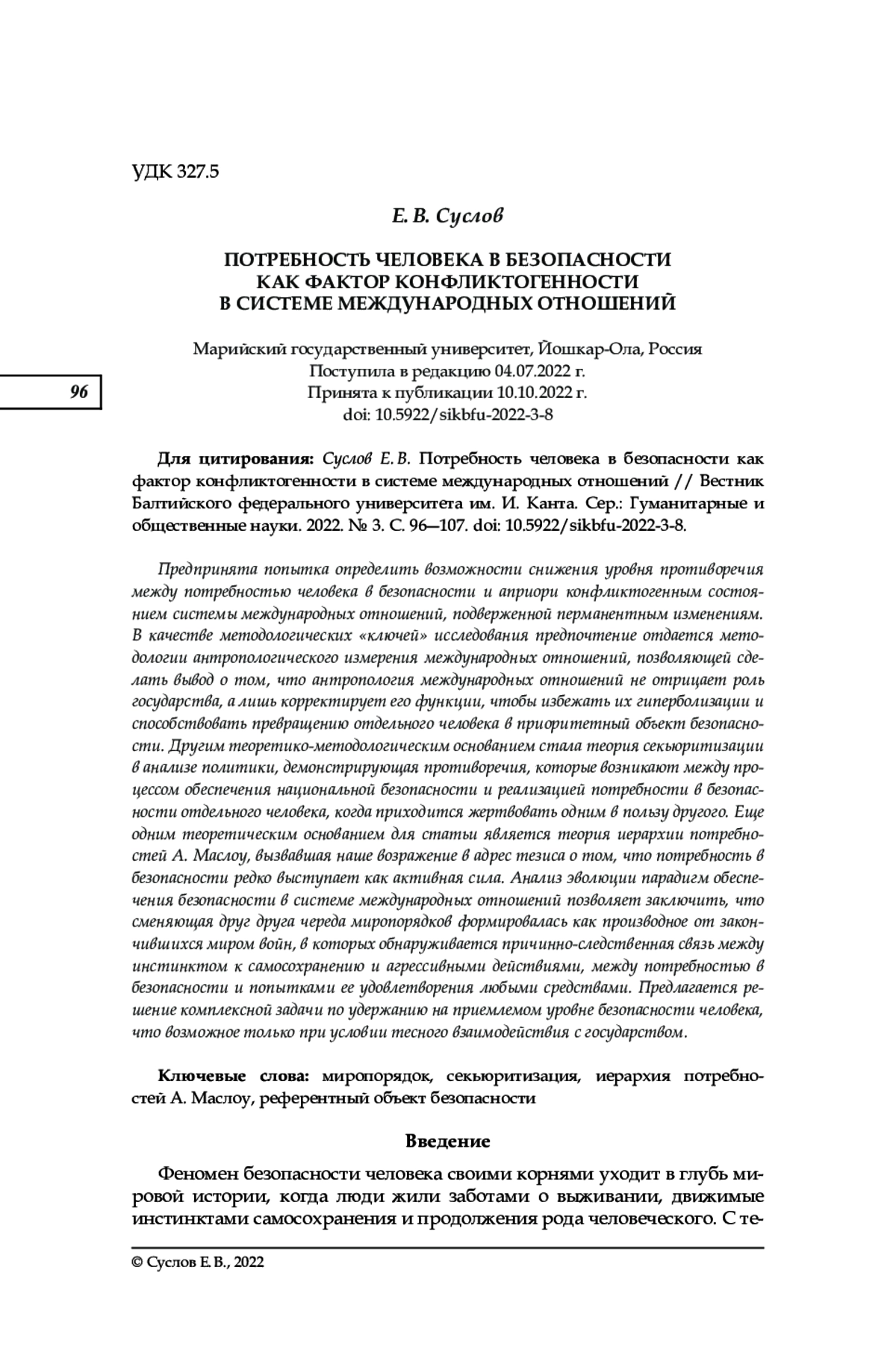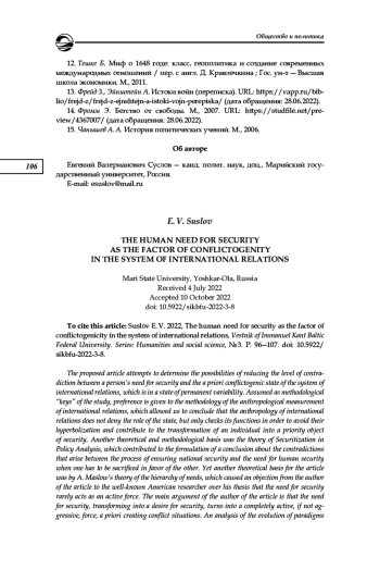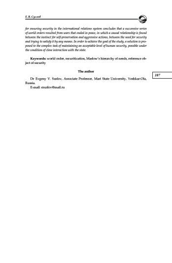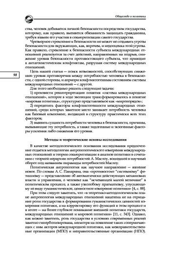 Предпринята попытка определить возможности снижения уровня противоречия между потребностью человека в безопасности и априори конфликтогенным состоянием системы международных отношений, подверженной перманентным изменениям. В качестве методологических «ключей» исследования предпочтение отдается методологии антропологического измерения международных отношений, позволяющей сделать вывод о том, что антропология международных отношений не отрицает роль государства, а лишь корректирует его функции, чтобы избежать их гиперболизации и способствовать превращению отдельного человека в приоритетный объект безопасности. Другим теоретико-методологическим основанием стала теория секьюритизации в анализе политики, демонстрирующая противоречия, которые возникают между процессом обеспечения национальной безопасности и реализацией потребности в безопасности отдельного человека, когда приходится жертвовать одним в пользу другого. Еще одним теоретическим основанием для статьи является теория иерархии потребностей А. Маслоу, вызвавшая наше возражение в адрес тезиса о том, что потребность в безопасности редко выступает как активная сила. Анализ эволюции парадигм обеспечения безопасности в системе международных отношений позволяет заключить, что сменяющая друг друга череда миропорядков формировалась как производное от закончившихся миром войн, в которых обнаруживается причинно-следственная связь между инстинктом к самосохранению и агрессивными действиями, между потребностью в безопасности и попытками ее удовлетворения любыми средствами. Предлагается решение комплексной задачи по удержанию на приемлемом уровне безопасности человека, что возможное только при условии тесного взаимодействия с государством